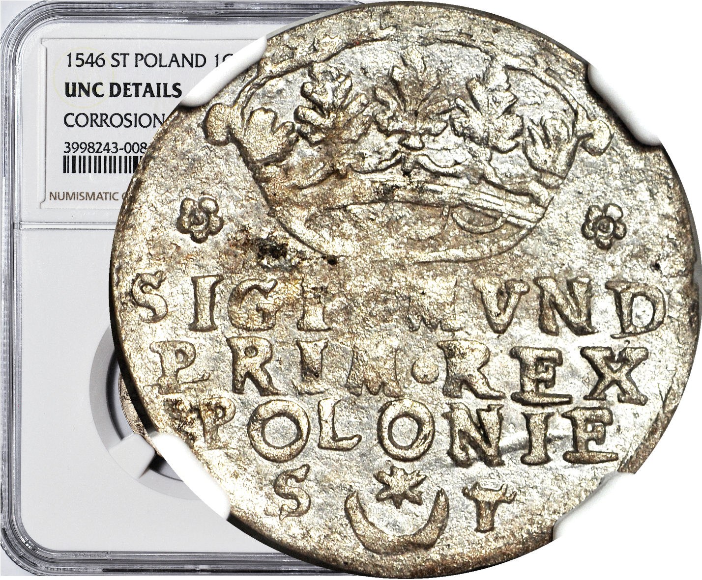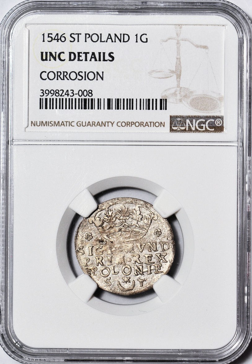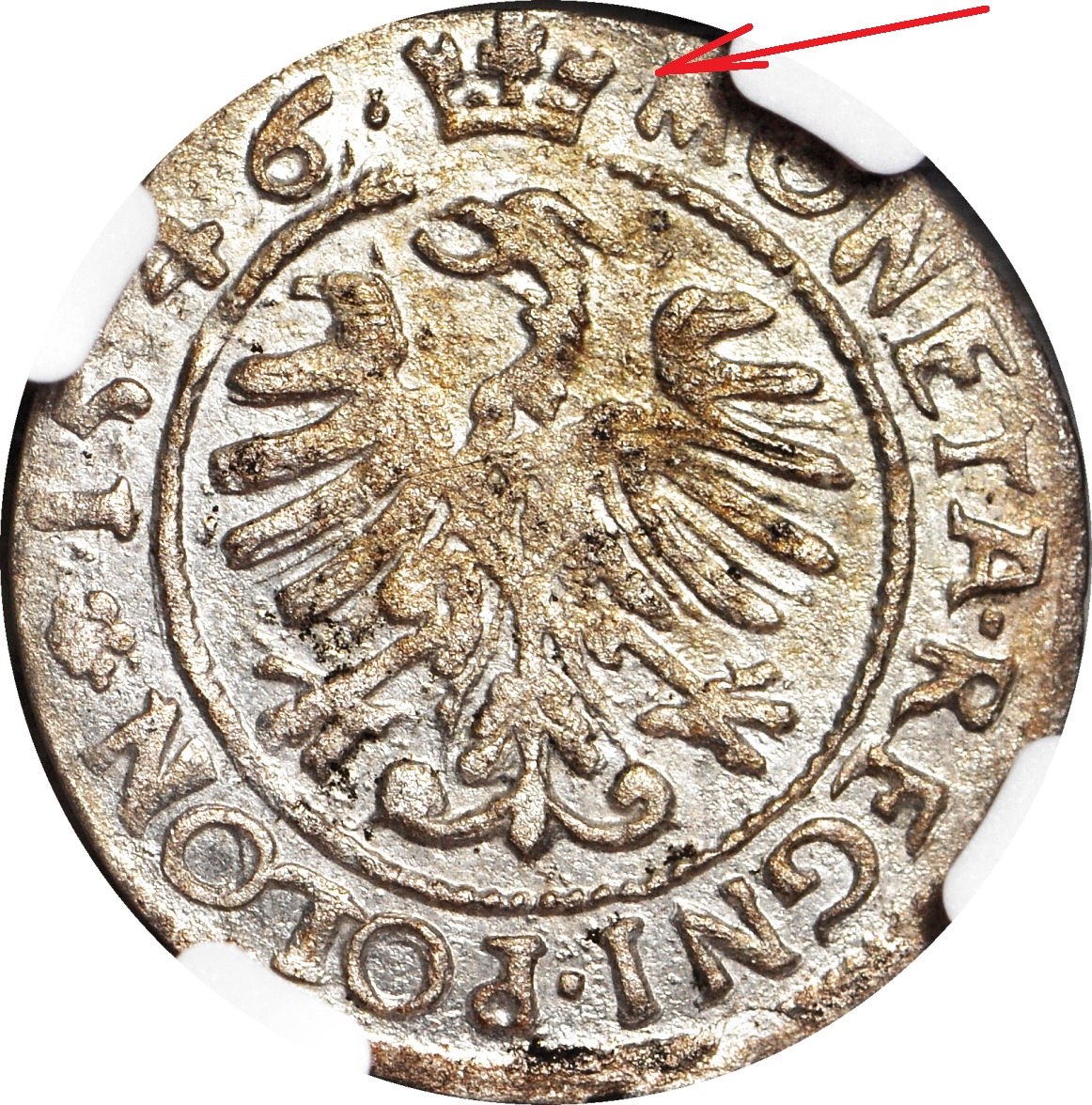 Korona 16, Orzeł typ 10A. W specjalistycznym katalogu groszy G. Romańczyka, opisanych jest 7 odmian grosza z orłem w typie 10A (charakterystyczne dolne zakończenie ogona). Pośród nich, 6 ma legendę POLON*, 5 z nich ma rzadkość R* i nie ma kropki pomiędzy koroną, a słowem MONETA, a ostatni z nich jest popularny, charakteryzujący się kropką pomiędzy koroną a słowem MONETA. Oferowany egzemplarz jest bez kropki, jak wszystkie 5 egzemplarzy o rzadkości R*, jednak nie jest to żadna z tych 5-ciu odmian. Mamy tu do czynienia z nieopisanym wariantem, orzeł, korona i legendy jak GK1546_88 jednak tu bez kropki po koronie która jest głównym wyróżnikiem tej odmiany. Piękne detale, ocenione w NGC na mennicze UNC.