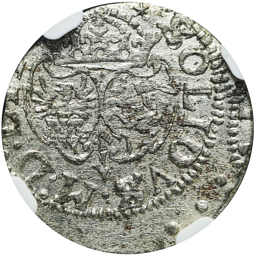 Bardzo rzadki szeląg litewski z pełną datą 16-17 i wygiętymi tarczami herbowymi. Minimalne niecentryczne bicie. Menniczy połysk. Piękny menniczy egzemplarz. Najwyższa nota zarówno w NGC jak i PCGS.