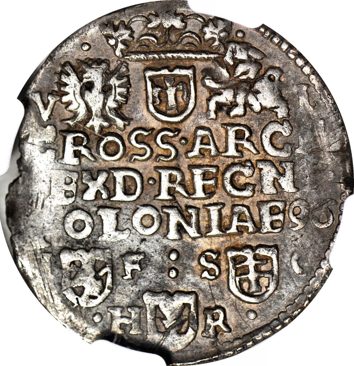 Awers: popiersie króla w prawo i napis wokoło SIGIS 3 D G REX POLO M D L. Rewers: napisy w poziomych wierszach V- Orzeł Snopek Pogoń -I / GROSS ARGE / SEXD REGNI / POLONIAE / 96 / I- herb Lewart Jana Firleja -F, S- herb Radwan Stanisława Cikowskiego -C / H- znak menniczy różą Hermana Rudigera -R.