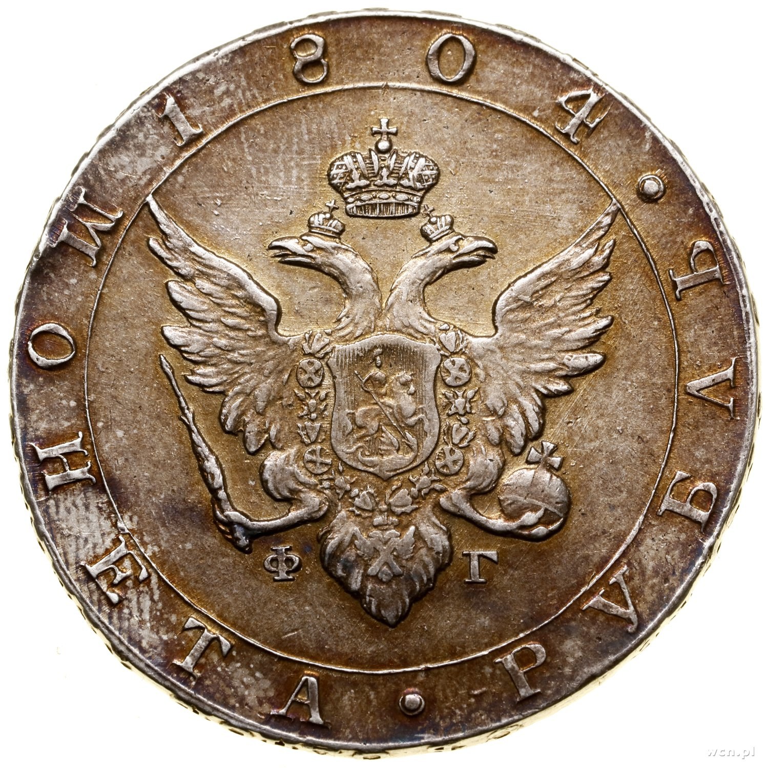 Aleksander I (1801–1825), Rubel, 1804, Petersburg; Adrianov 1804, Bitkin 38, GM 3.3, Uzdenikow 1354; srebro, 20.73 g; na rewersie niewielkie defekty krążka, rzadki, ładnie zachowany egzemplarz, w złotawej patynie.