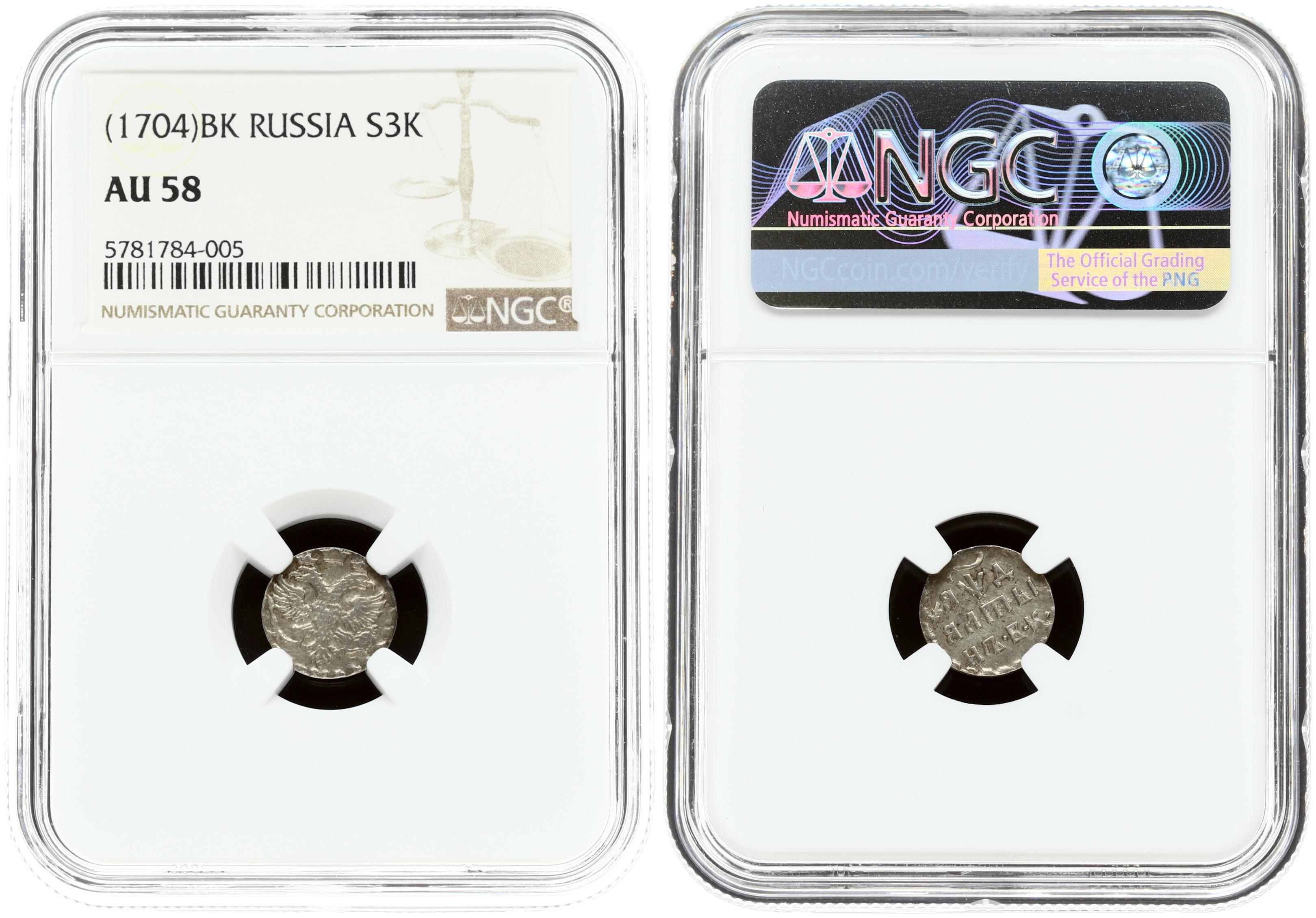 Russia 1 Altyn (1704) БК 'ЯWД'. Peter I (1699-1725). Obverse: Eagle. Reverse: Denomination ALTYN and date. Silver. Edge plain. Bitkin 1156. NGC AU 58