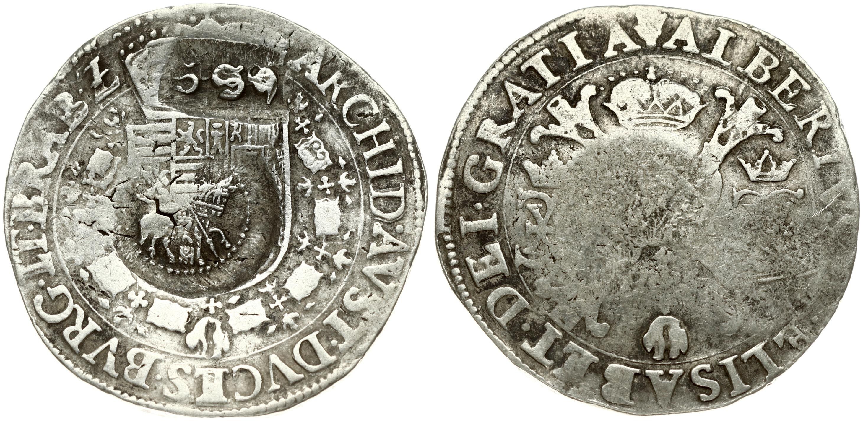 Russia 1 Jefimok 1655 - Spanish Netherlands BRABANT 1 Patagon (1612-21) Antwerp. Alexei Michailowitsch(1645-1676). Overstruck on one. With two counterstamps on the back: 1) St. George fighting the dragon; 2) the year 1655. Spanish Netherlands BRABANT 1 Patagon (1612-21) Antwerp. Albert & Isabella (1612-1621). Averse: St. Andrew's cross; crown above; fleece below divide pairs of crowned C monograms. Reverse: Crowned shield in collar of the Golden Fleece. Reverse Legend: …BVRG ET BRAB (Zc). Silver. KM 35.1; Vanhoudt 619.AN (R3) RARE