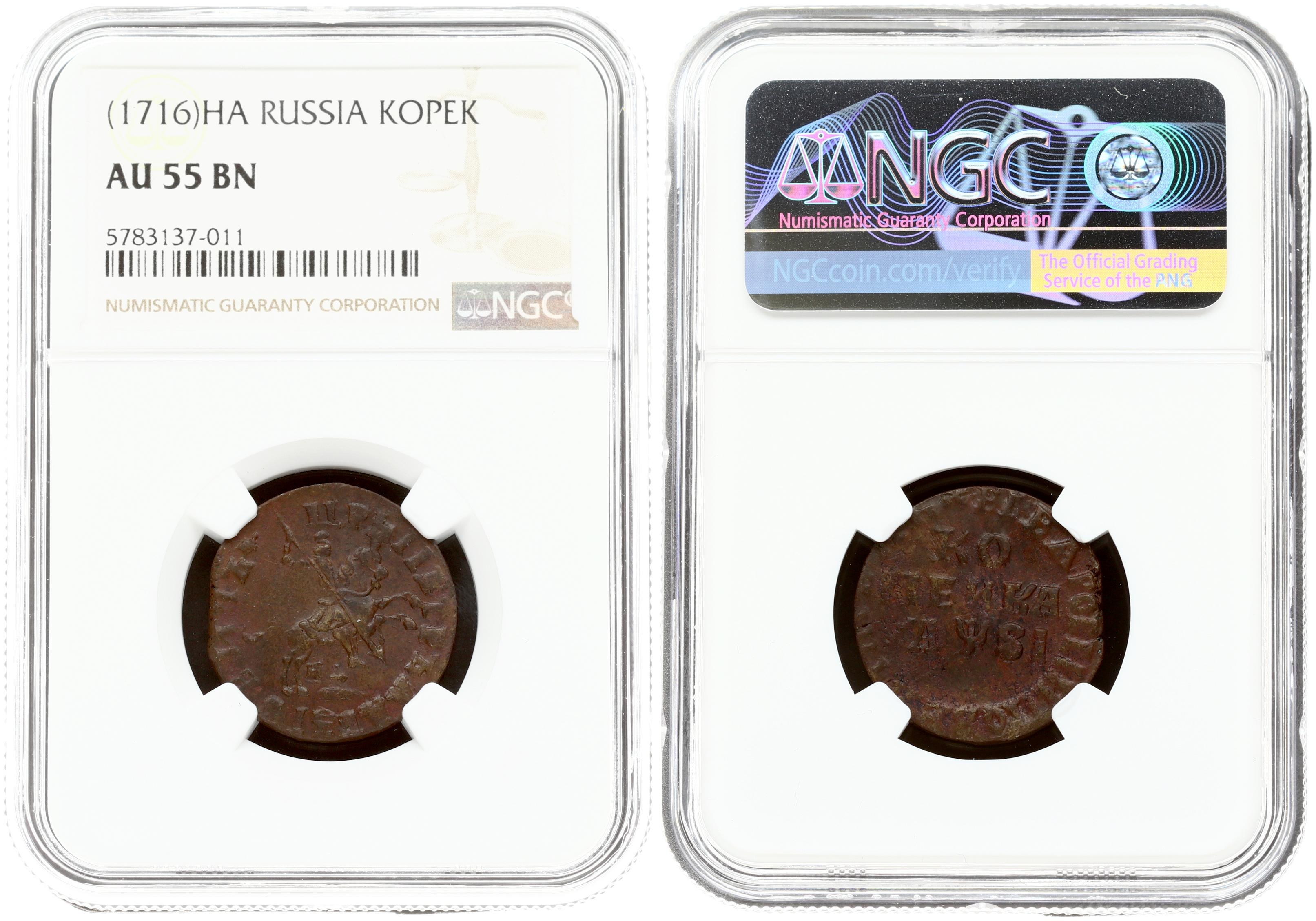 Russia 1 Kopeck (1716) HД Peter I (1699-1725). Obverse: St. George on horse. Reverse: Value date. Reverse Legend: RULER OF ALL THE RUSSIAS. Copper. Edge plain. Bitkin 3099 (R-R3) RARE NGC AU 55 BN ONLY ONE COIN IN HIGHER GRADE