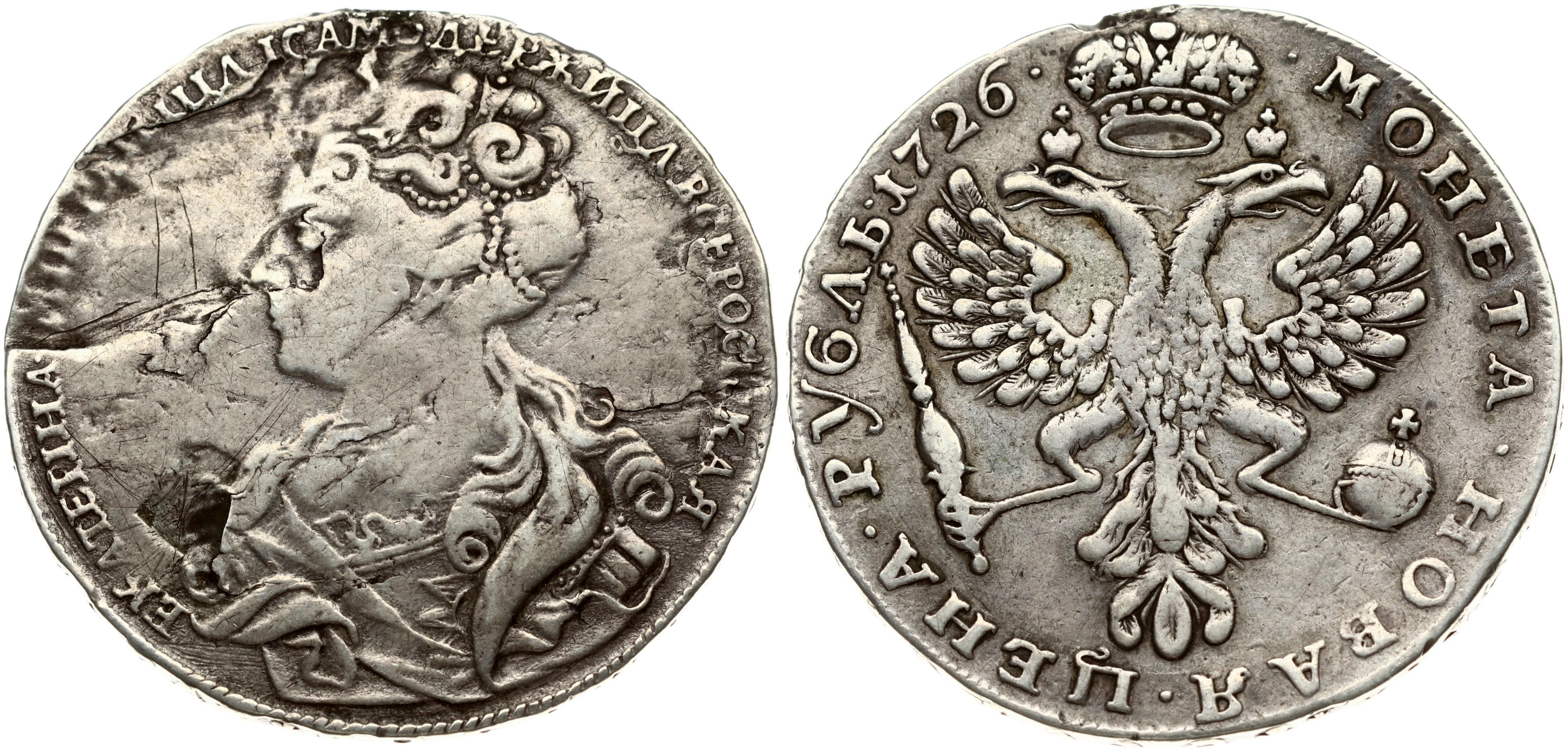 Russia 1 Rouble 1726 Catherine I (1725-1727). Obverse: Bust left. Reverse: Crown above crowned double-headed eagle. 'Moscow type; portrait turned to the left'. Narrow tail. Silver. Edge inscription. Damaged coin. Bitkin 17