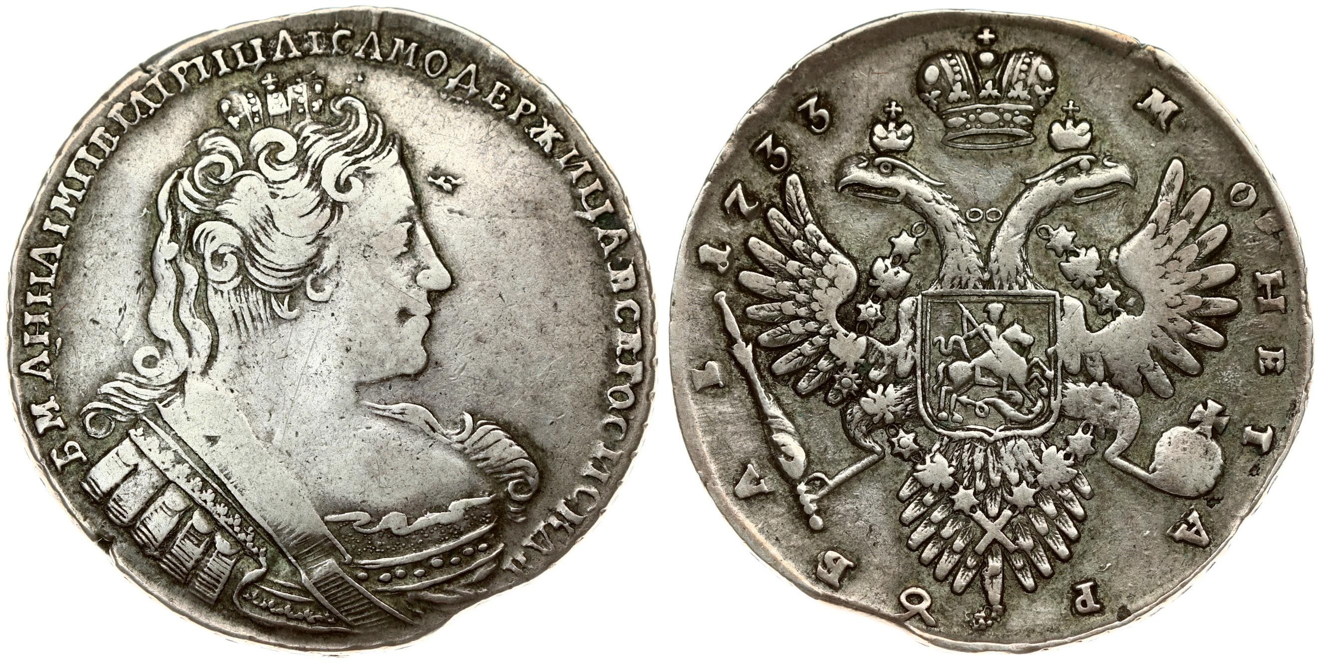 Russia 1 Rouble 1733 Anna Ioannovna (1730-1740). Plain cross of orb. Averse: Bust right. Reverse: Crown above crowned double-headed eagle shield on breast. Without brooch on bosom. Edge patterned. Silver. Repaired. Bitkin 64