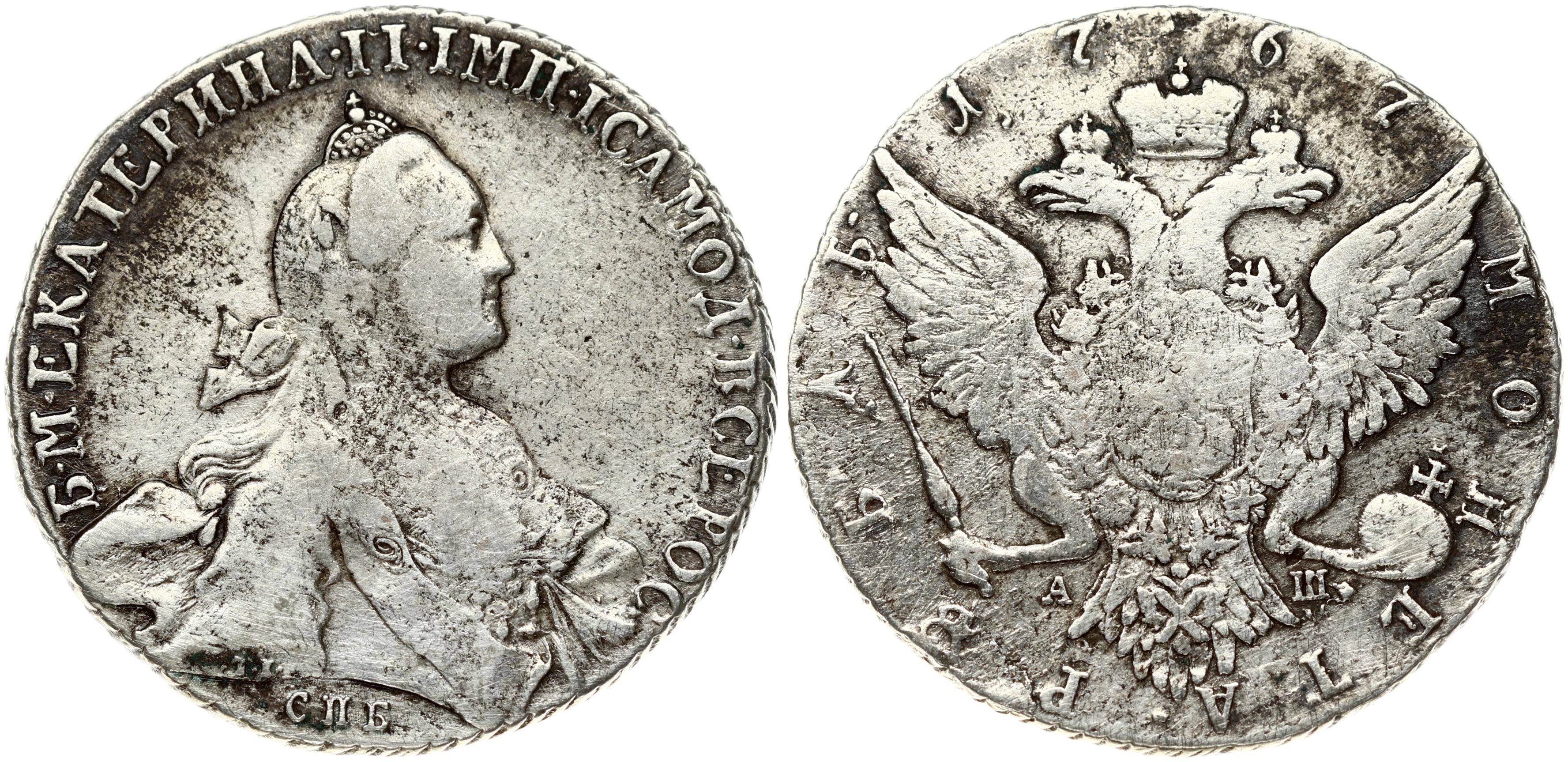 Russia 1 Rouble 1767 СПБ-АШ St. Petersburg. Catherine II (1762-1796). Obverse: Crowned bust right. Reverse: Crown above crowned double-headed eagle shield on breast X on tail. Standard portrait. Silver. Edge cordlike leftwards. Bitkin 201