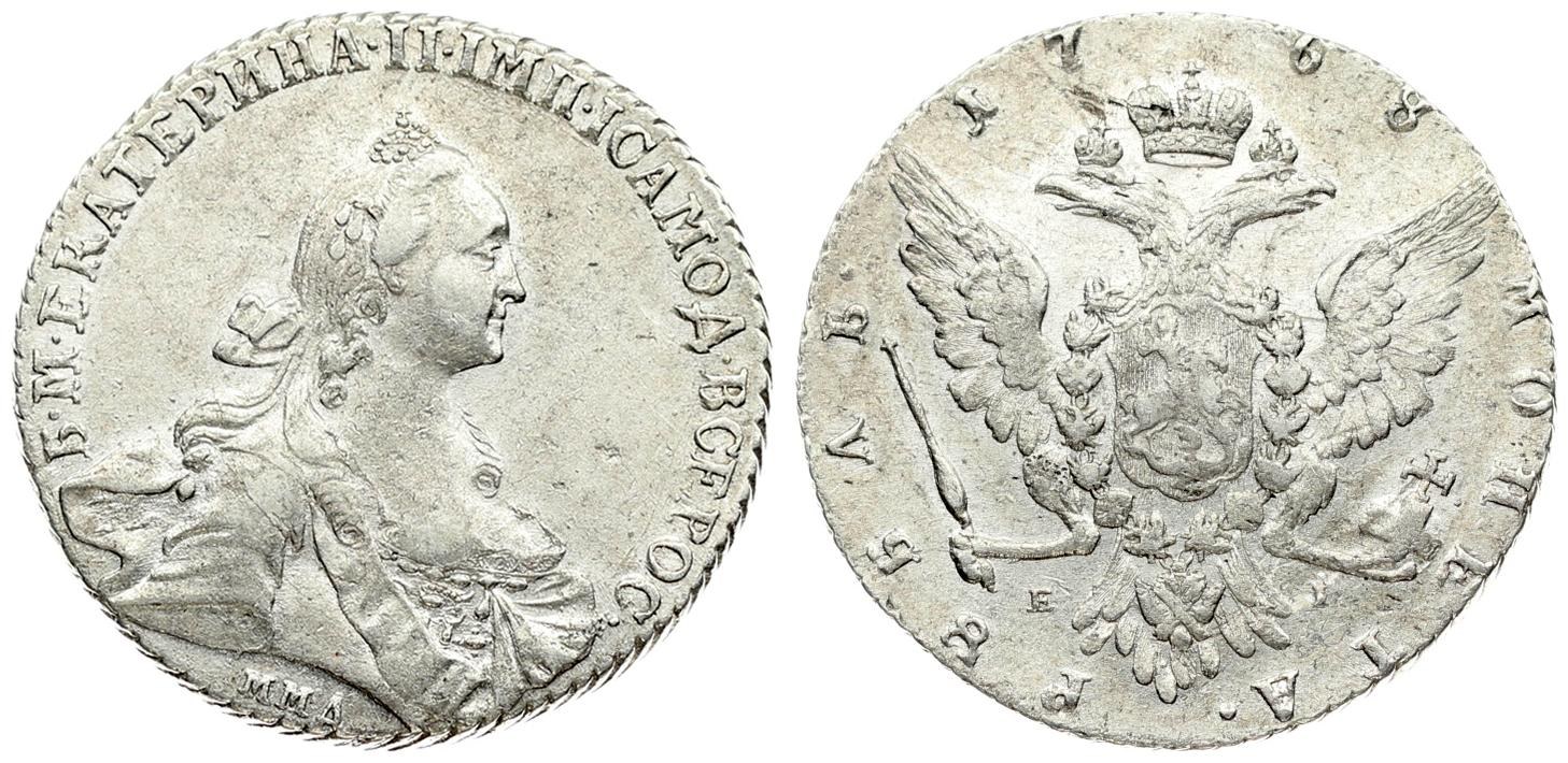 Russia 1 Rouble 1768 ММД-EI Moscow. Catherine II (1762-1796). Averse: Crowned bust right. Reverse: Crown above crowned double-headed eagle shield on breast X on tail. Standard portrait. Silver. Edge cordlike leftwards. Bitkin 129