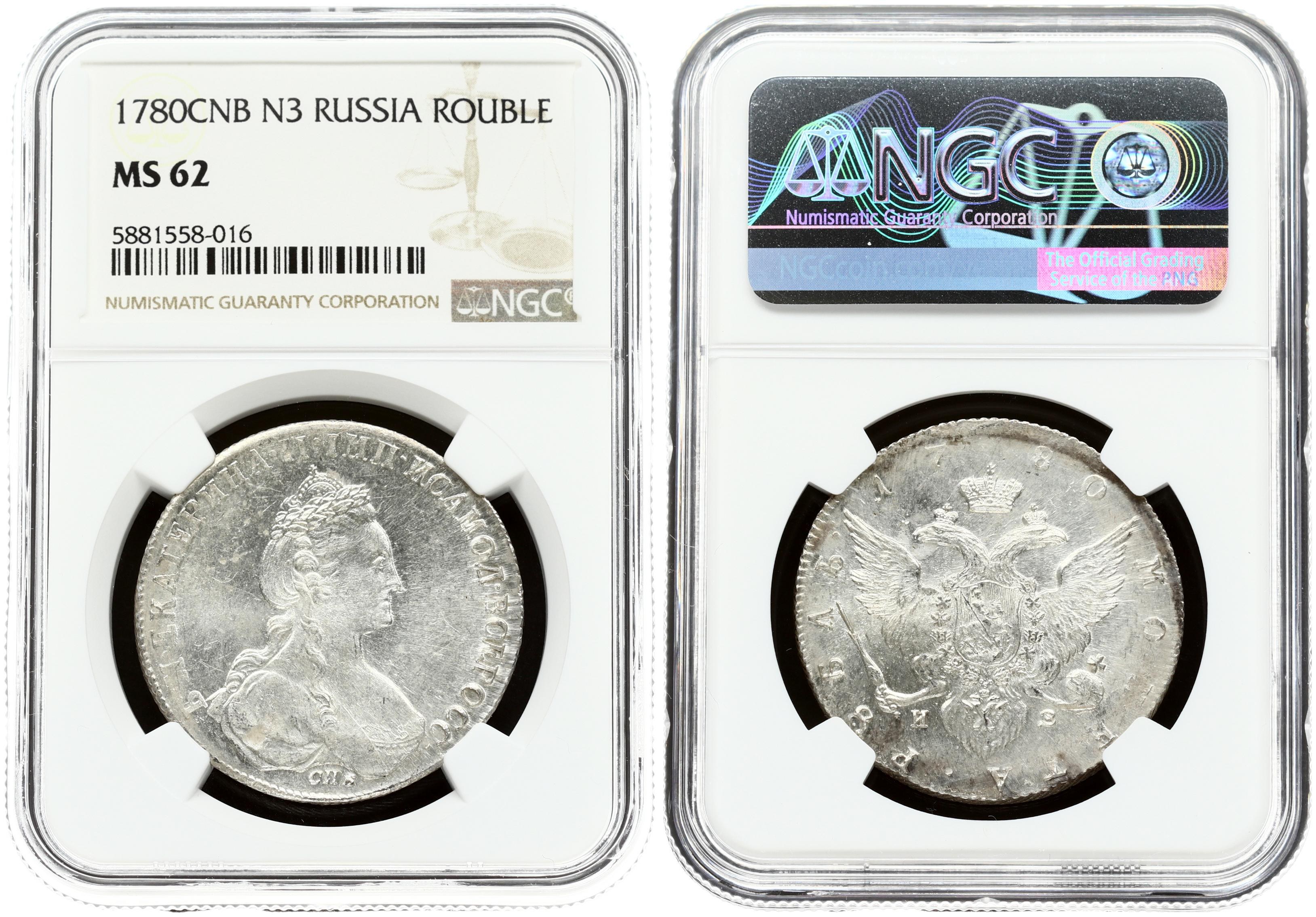 Russia 1 Rouble 1780 СПБ-ИЗ St. Petersburg. Catherine II (1762-1796). Obverse: Crowned bust right. Reverse: Crown above crowned double-headed eagle shield on breast X on tail. Silver. Edge cordlike leftwards. Bitkin 228. NGC MS 62 ONLY 5 COINS IN HIGHER GRADE