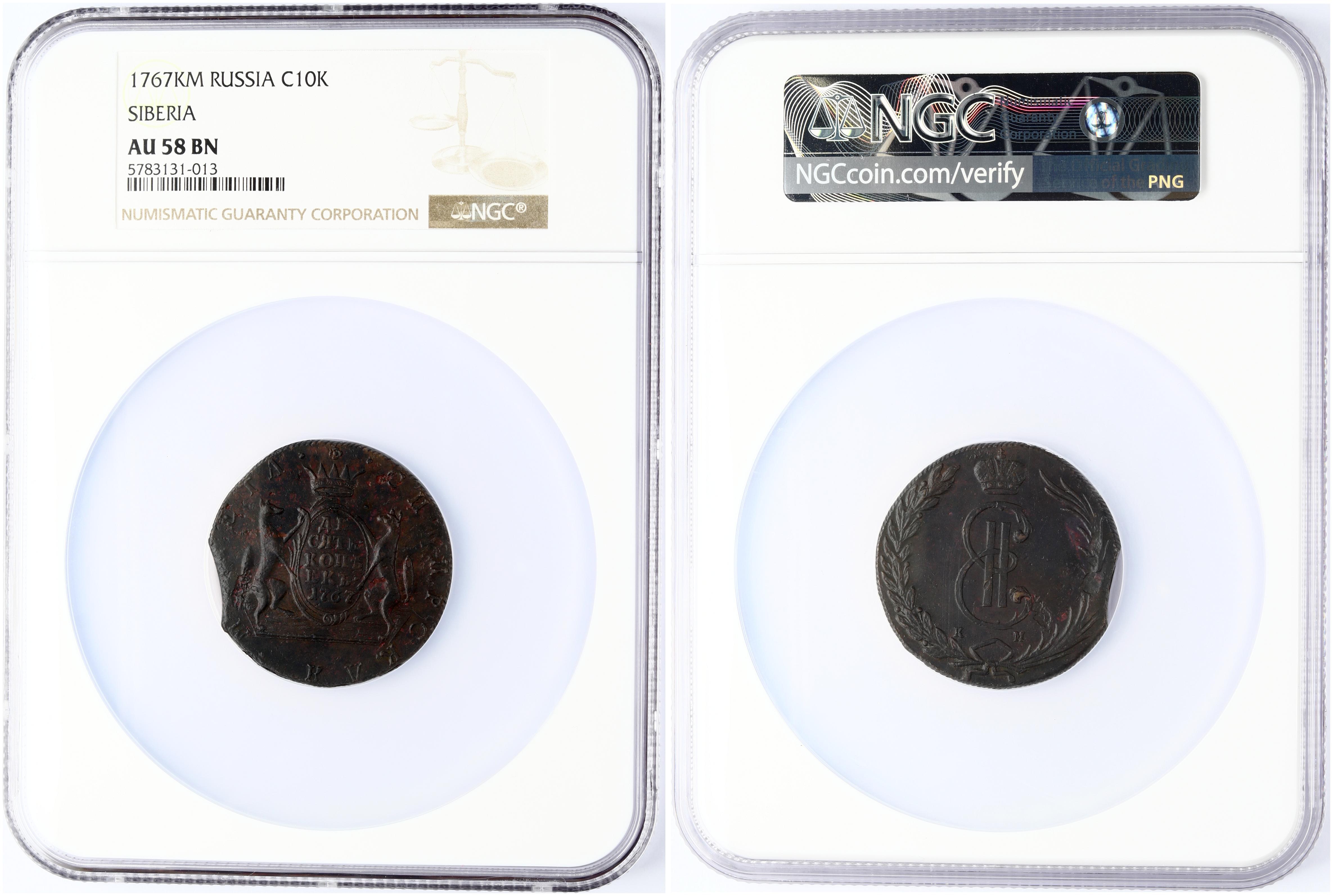 Russia 10 Kopecks 1767 КМ Siberia. Catherine II (1762-1796). Obverse: Crowned monogram within wreath. Reverse: Value date within crowned oval shield with supporters. Copper. Edge cordlike leftwards. Bitkin 1016. NGC AU 58 BN ONLY 2 COINS IN HIGHER GRADE