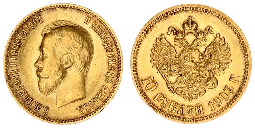 Russia 10 Roubles 1903 AP St. Petersburg. Nicholas II (1894-1917). Averse: Head left. Reverse: Crowned double-headed imperial eagle ribbons on crown. Gold. Edge inscription. Bitkin 11