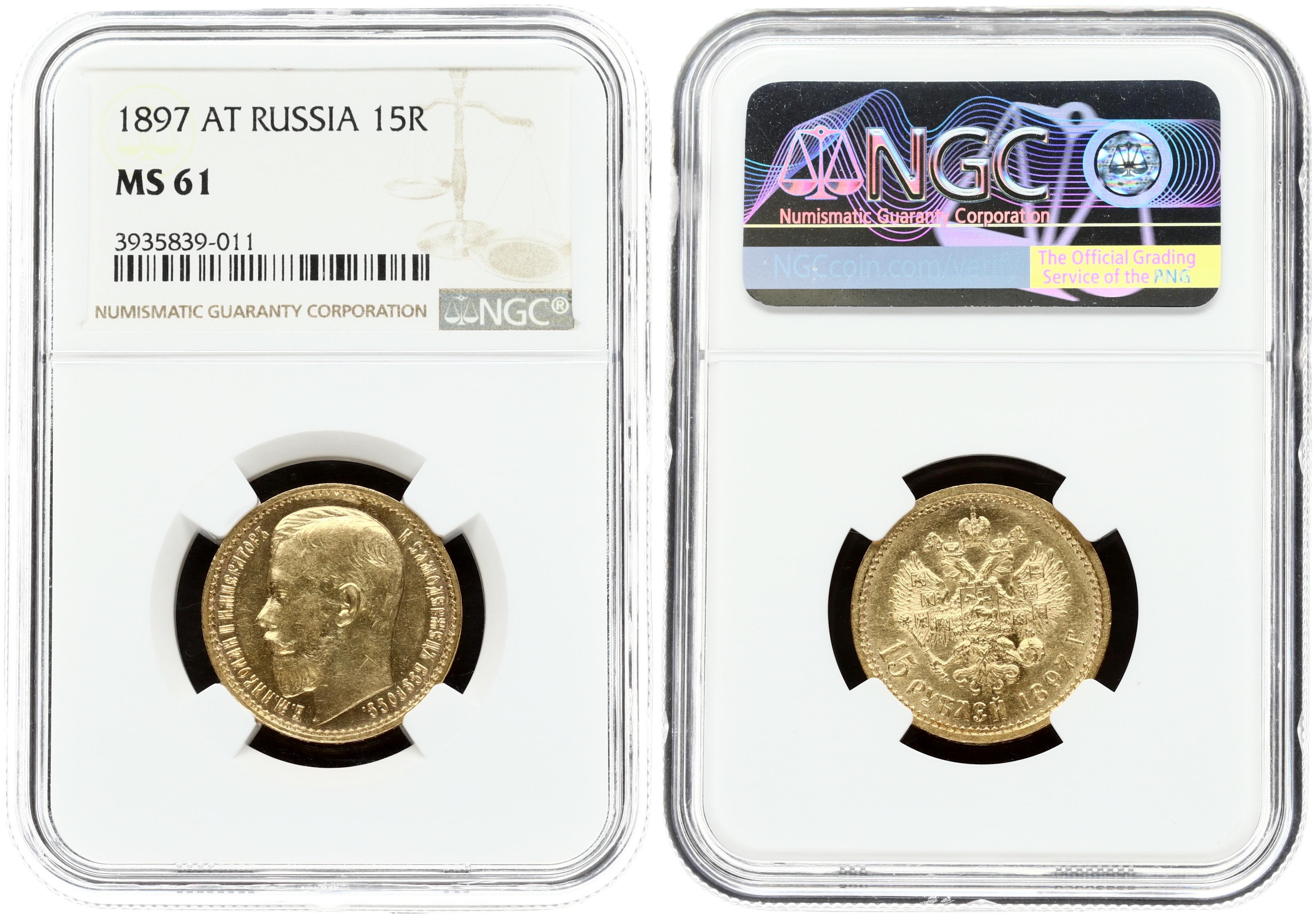 Russia 15 Roubles 1897 (АГ) St. Petersburg. Nicholas II (1894-1917). Obverse: Head left. Reverse: Crowned double-headed imperial eagle ribbons on crown. Three last letters are above the edge of the neck. Gold. Edge inscription. Bitkin 2. NGC MS 61