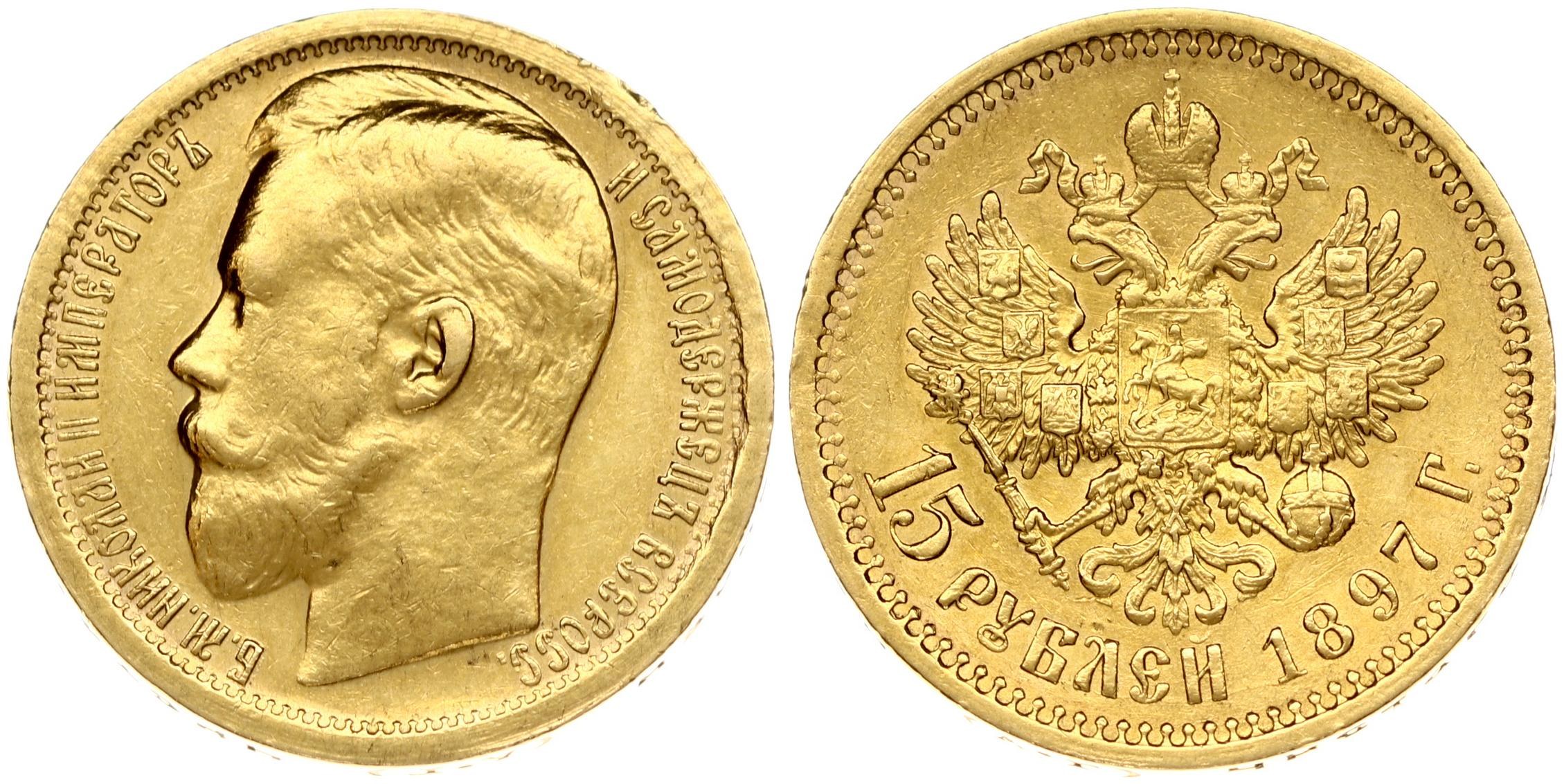 Russia 15 Roubles 1897 (АГ) St. Petersburg. Nicholas II (1894-1917). Obverse: Head left. Reverse: Crowned double...
