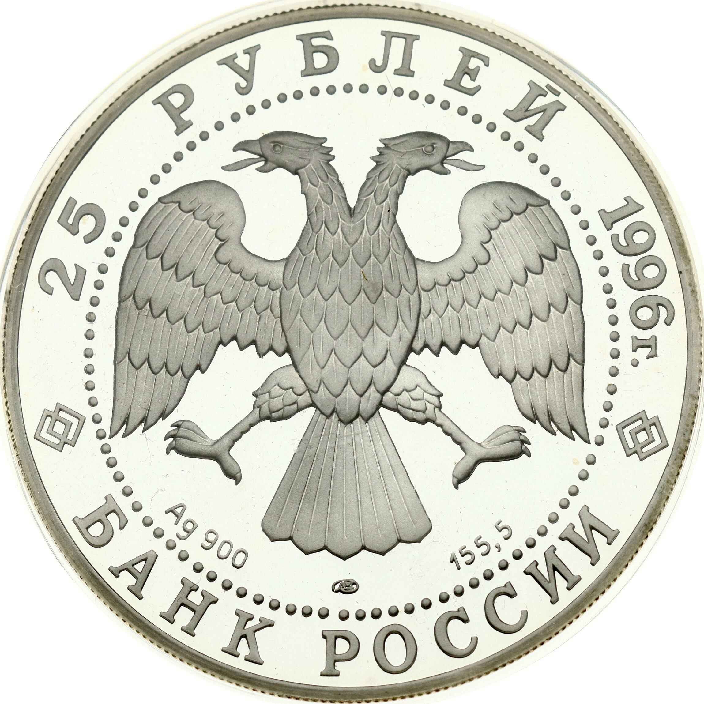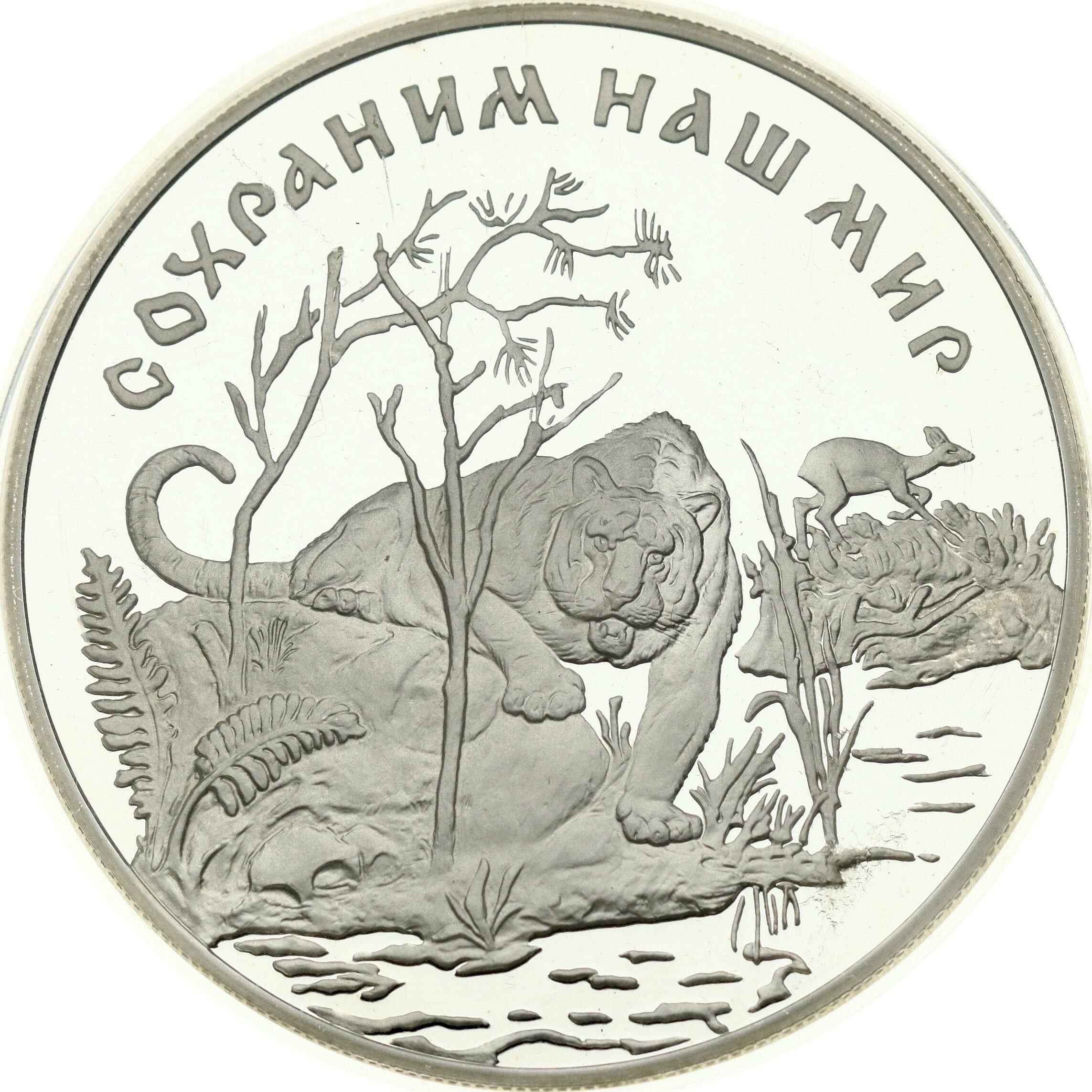 Russia 25 Roubles 1996 (L) Amur Tiger. Obverse: Two-headed eagle designed by artist I. Bilibin. The inscriptions along the rim: at the top — «25 РУБЛЕЙ 1996 г.» (25 RUBLES 1996); at the bottom — «БАНК РОССИИ» (BANK OF RUSSIA). The letters below indicate the metal sign; the fineness; the fine metal content and the mint trademark. Reverse: An Amur tiger on the prowl at a pond with plants and rocks in the background, further in the background - a fleeing roe deer. The inscription along the rim - СОХРАНИМ НАШ МИР (PROTECT OUR WORLD). Edge Reeded. Silver 173.29g. Y 536