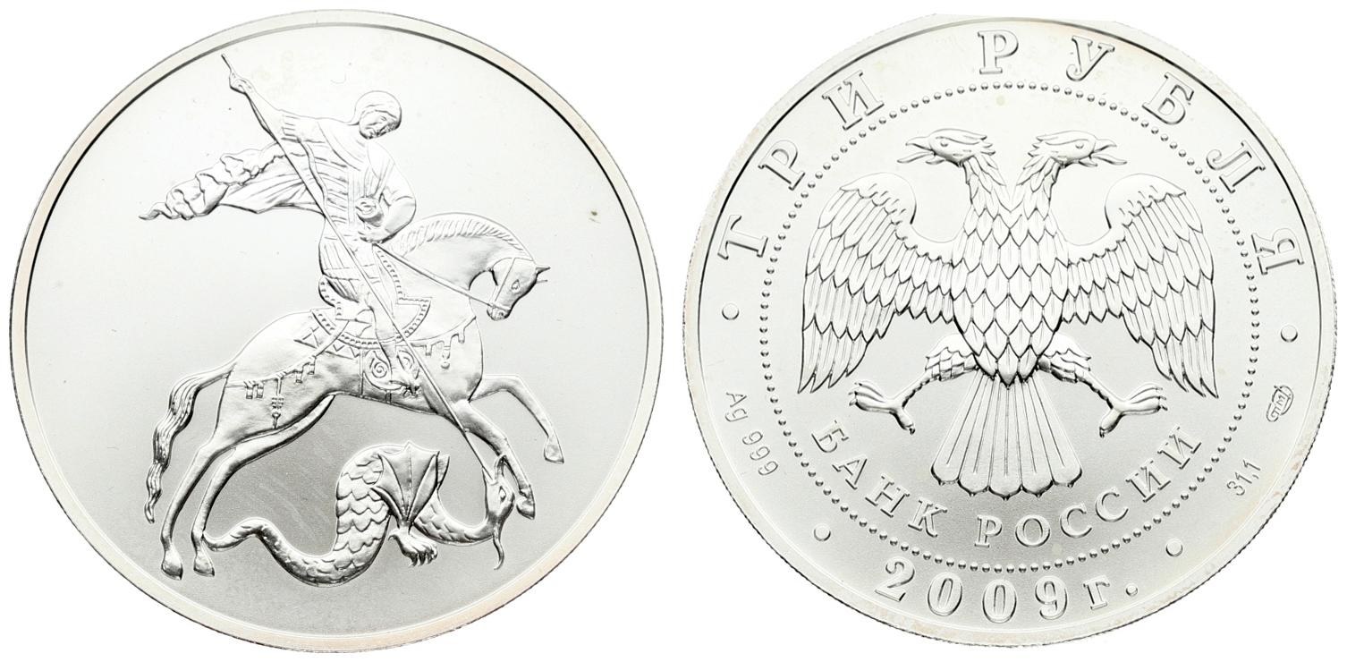 Russia 3 Roubles 2009 Saint George the Victorious. Averse: In the centre - the emblem of the Bank of Russia [the two-headed eagle with wings down; under it - the semicircular inscription БАНК РОССИИ (BANK OF RUSSIA)] framed by a circle of dots and inscriptions along the rim - on top: ТРИ РУБЛЯ (THREE RUBLES); below: to the left - indications of the precious metal and its fineness; in the centre - the year of issue 2009 г. (2009); to the right - the fine metal content and the mint trade mark. Lettering: THREE RUBLES BANK OF RUSSIA Ag 925 • 2009 year • 31.1 SPMD. Reverse: In image of Saint George the Victorious sitting on horseback and spearing a dragon. Edge Reeded; 300 corrugations. Silver. Y 1180
