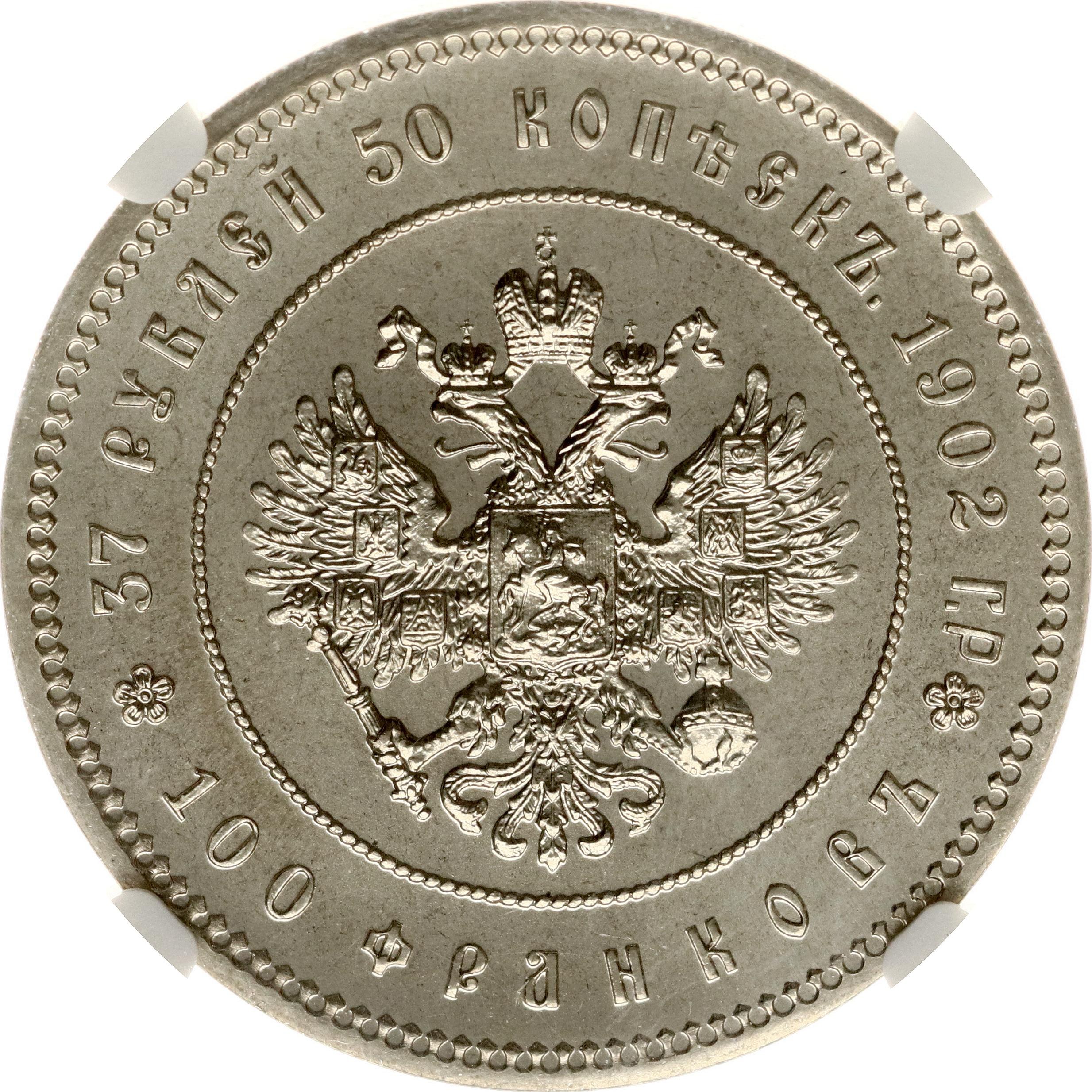 Russia. 37 Roubles 50 Kopecks / 100 Francs 1902 (1991), Restrike. Copper-nickel. Y B65a, Bit H316. NGC MS 68.