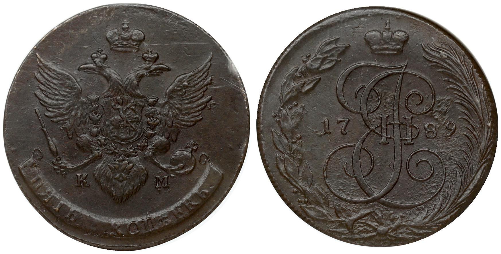 Russia. Catherine II (1762-1796). 5 Kopecks 1789 KM, Suzun mint. Copper. Bitkin 799 (R), Diakov 630. NGC MS 61 BN