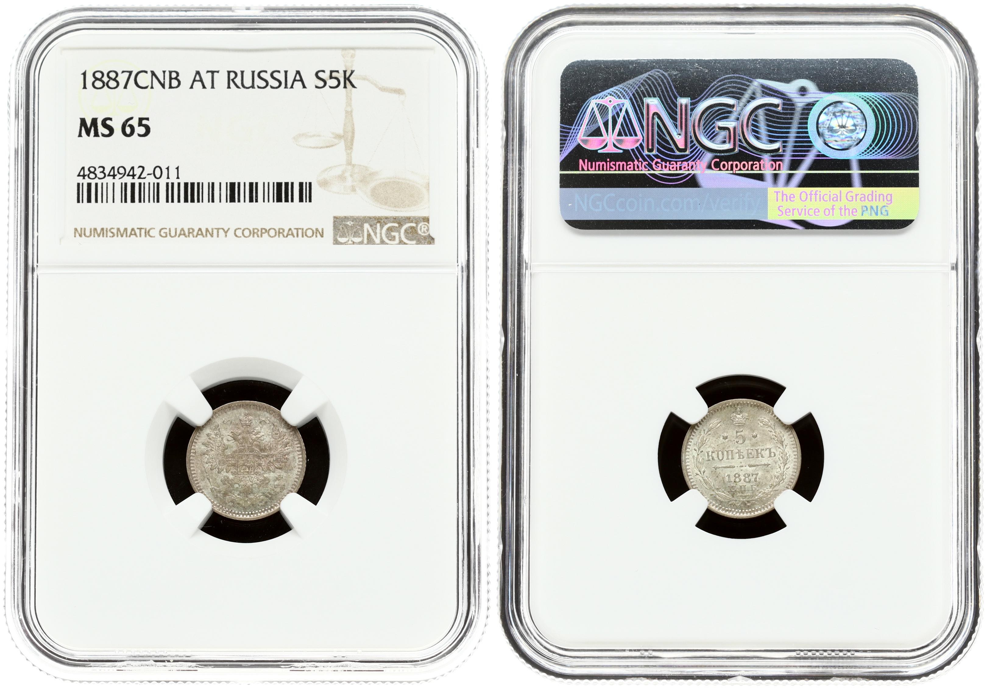 Russia 5 Kopecks 1887 СПБ-АГ St. Petersburg. Alexander III (1881-1894). Obverse: Crowned double-headed imperial eagle. Reverse: Crown above date and value within wreath. Silver. Edge ribbed. Bitkin 147. NGC MS 65