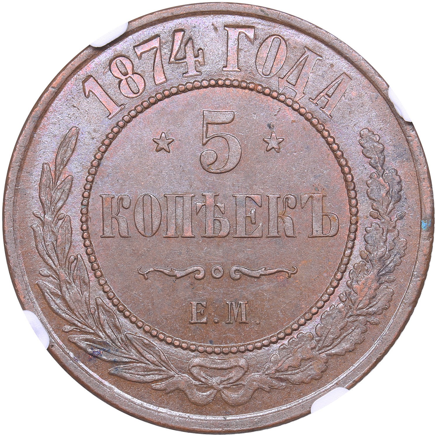 Russia 5 kopeks 1874 ЕМ - NGC MS 63 BN