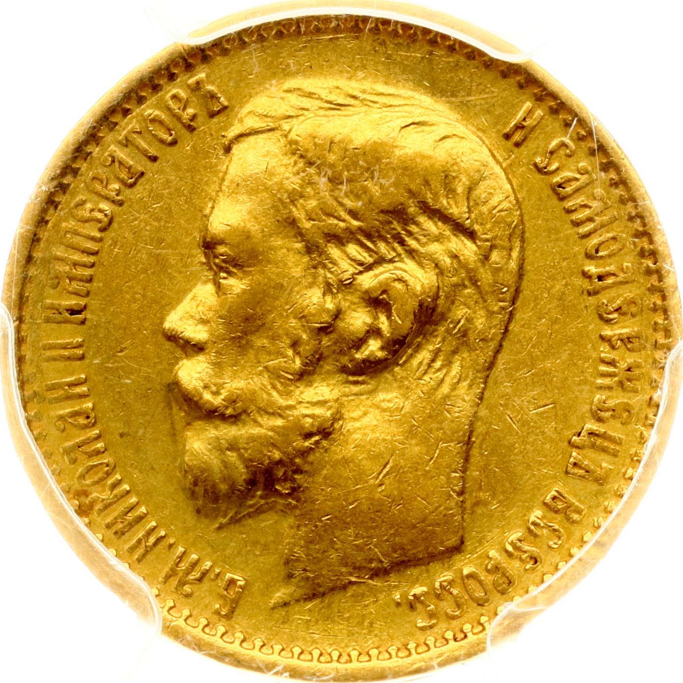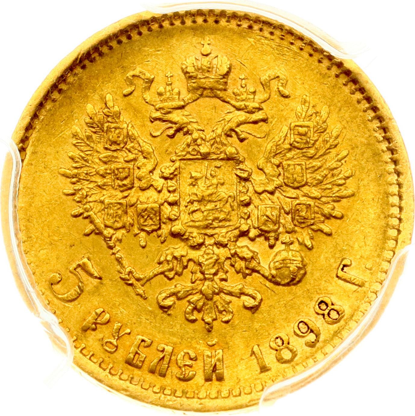 Russia. Nicholas II (1894-1917). 5 Roubles 1898 АГ, St. Petersburg. Gold. Bitkin 20. PCGS AU 53.