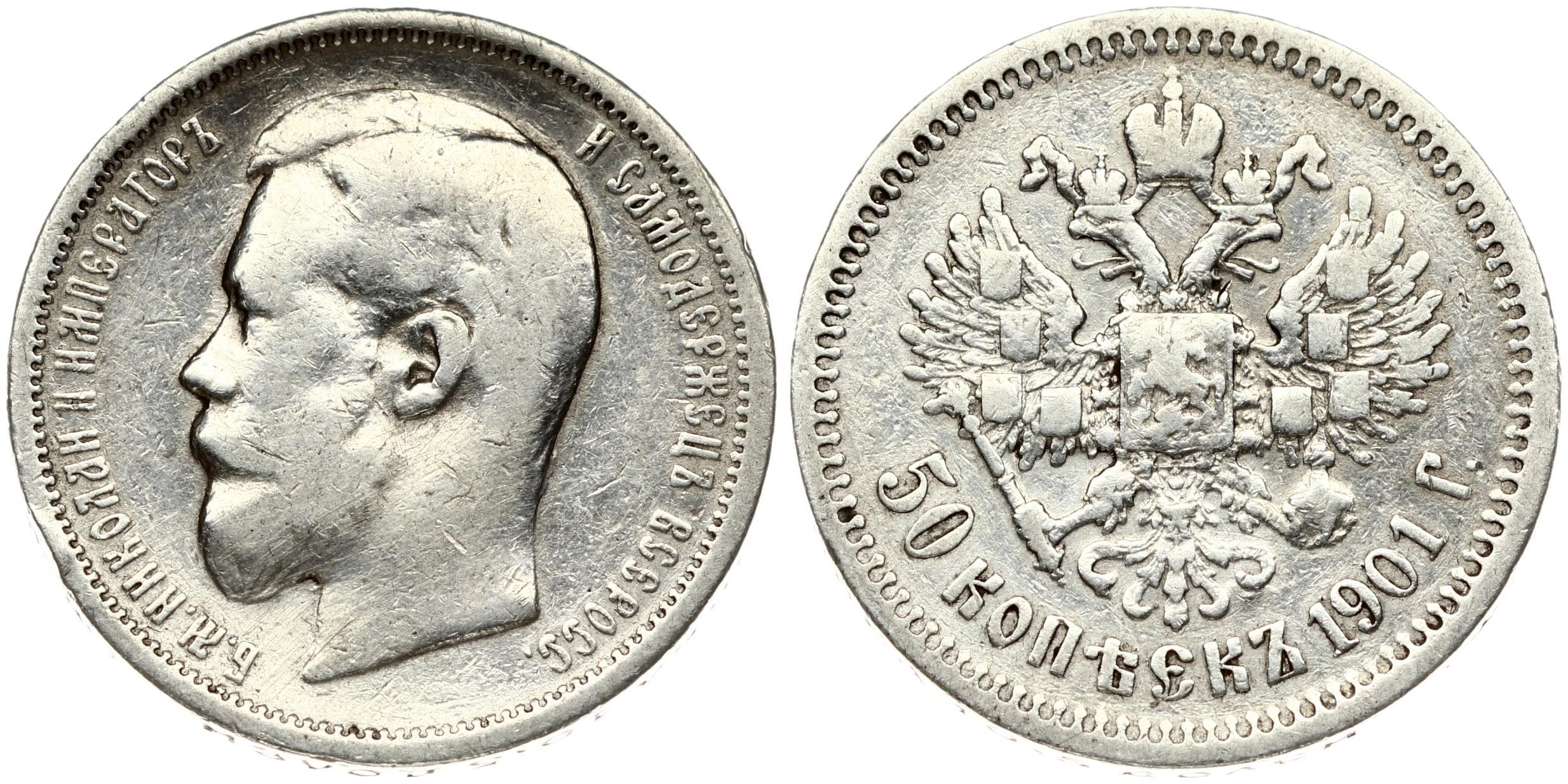 Russia 50 Kopecks 1901 (ФЗ) St. Petersburg. Nicholas II (1894-1917). Obverse: Head left. Reverse: Crowned double...