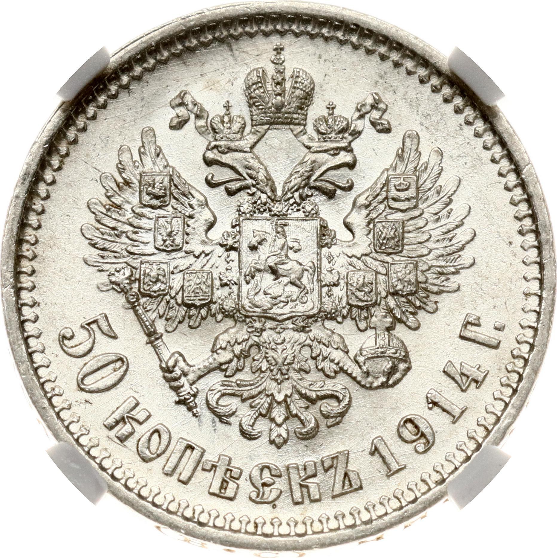 Russia. Nicholas II (1894-1917). 50 Kopecks 1914 BC, St. Petersburg. Silver. Bitkin 94 (R) NGC MS 62