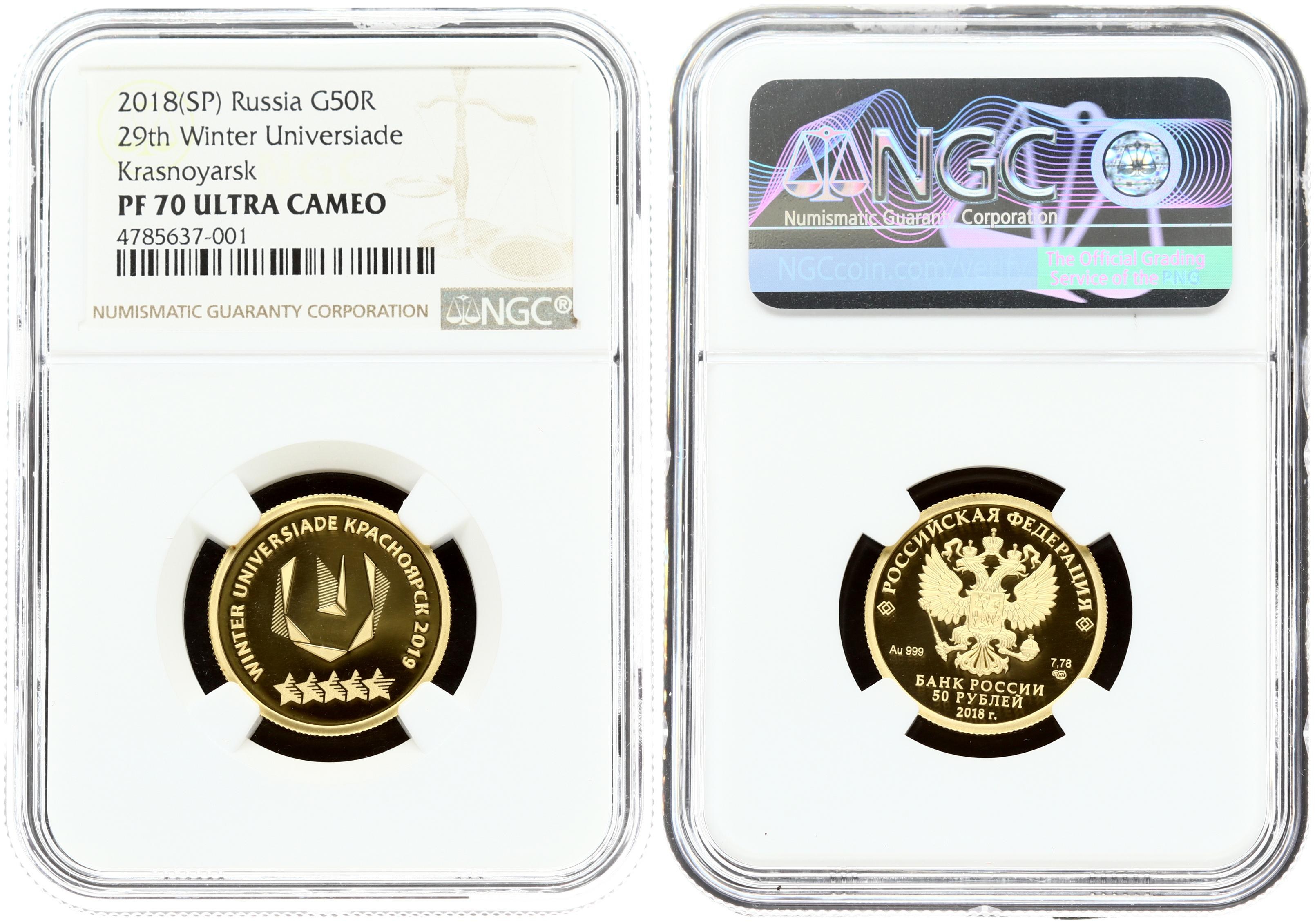 Russia 50 Roubles 2018 29th Winter Universiade of 2019 in the city of Krasnoyarsk. Obverse: On the mirror field of the disc – the relief image of the National Coat of Arms of the Russian Federation; over it – the semicircular inscription along the rim: РОССИЙСКАЯ ФЕДЕРАЦИЯ (RUSSIAN FEDERATION); framed on both sides by doubled rhombuses; below under the coat of arms: to the left – indications of the precious metal and its finenes; to the right – the fine metal content and the mint trade mark; on bottom in the centre; in three lines – the inscription: БАНК РОССИИ (BANK OF RUSSIA); the denomination of the coin; the year of issue. Reverse: A relief image of the 29th Winter Universiade logotype. The inscription along the circumference reads WINTER UNIVERSIADE КРАСНОЯРСК 2019 (WINTER UNIVERSIADE KRASNOYARSK 2019). Edge Reeded. Gold 7.78g. (Mintage 1500pcs). NGC PF 70 ULTRA CAMEO TOP POP