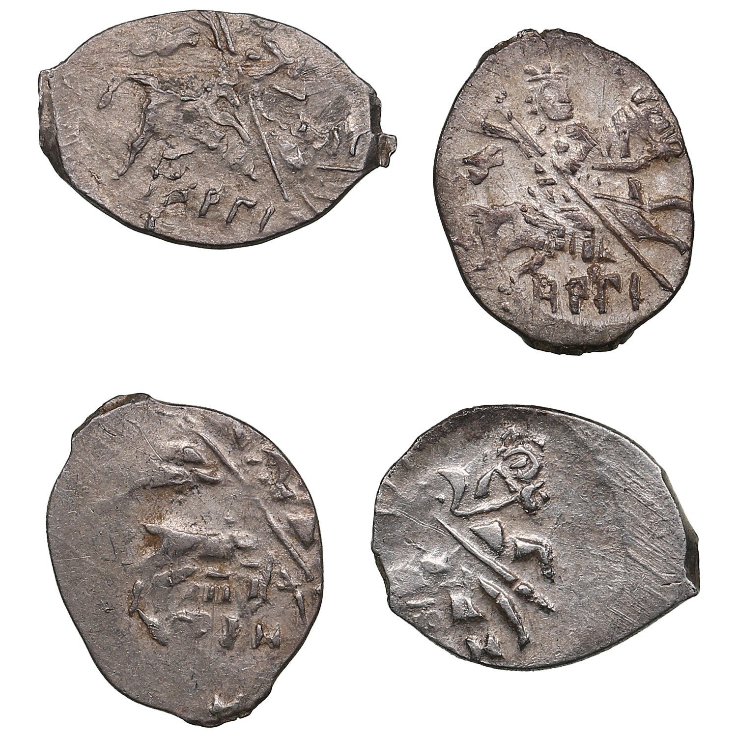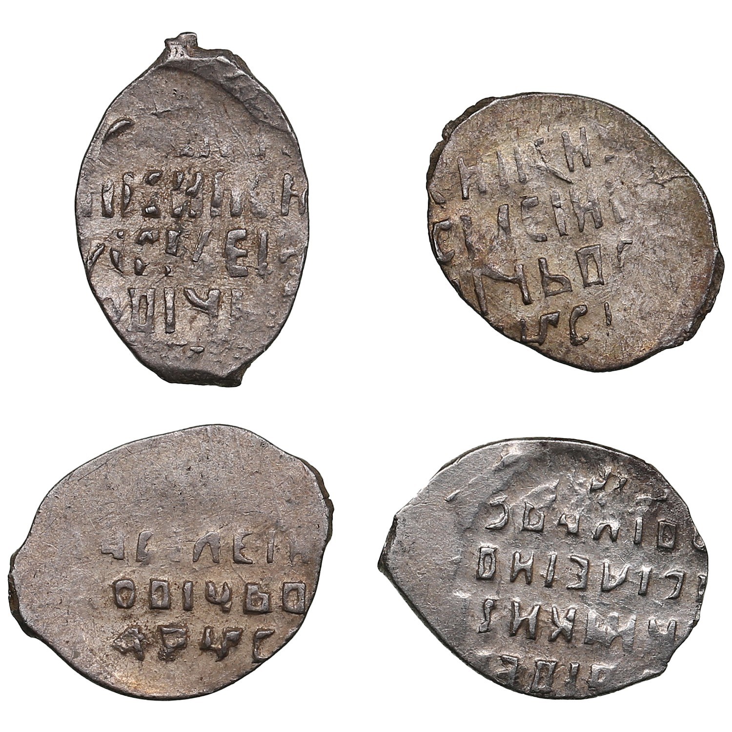 Various condition. Lot includes: Kopeck (Novgorod), HPГI. KG 327; GKH2 357 (2). Obverse die of False Dmitry dated 1605; reverse die with a name Vasily Ivanovich Shuisky (1606-1610). Kopeck (Novgorod), РIH. KG 325; GKH2 354 (2). Obverse die dated 1610; reverse die with a name Vasily Ivanovich Shuisky (1606-1610). Issue historically associated with present-day Russia and Sweden.