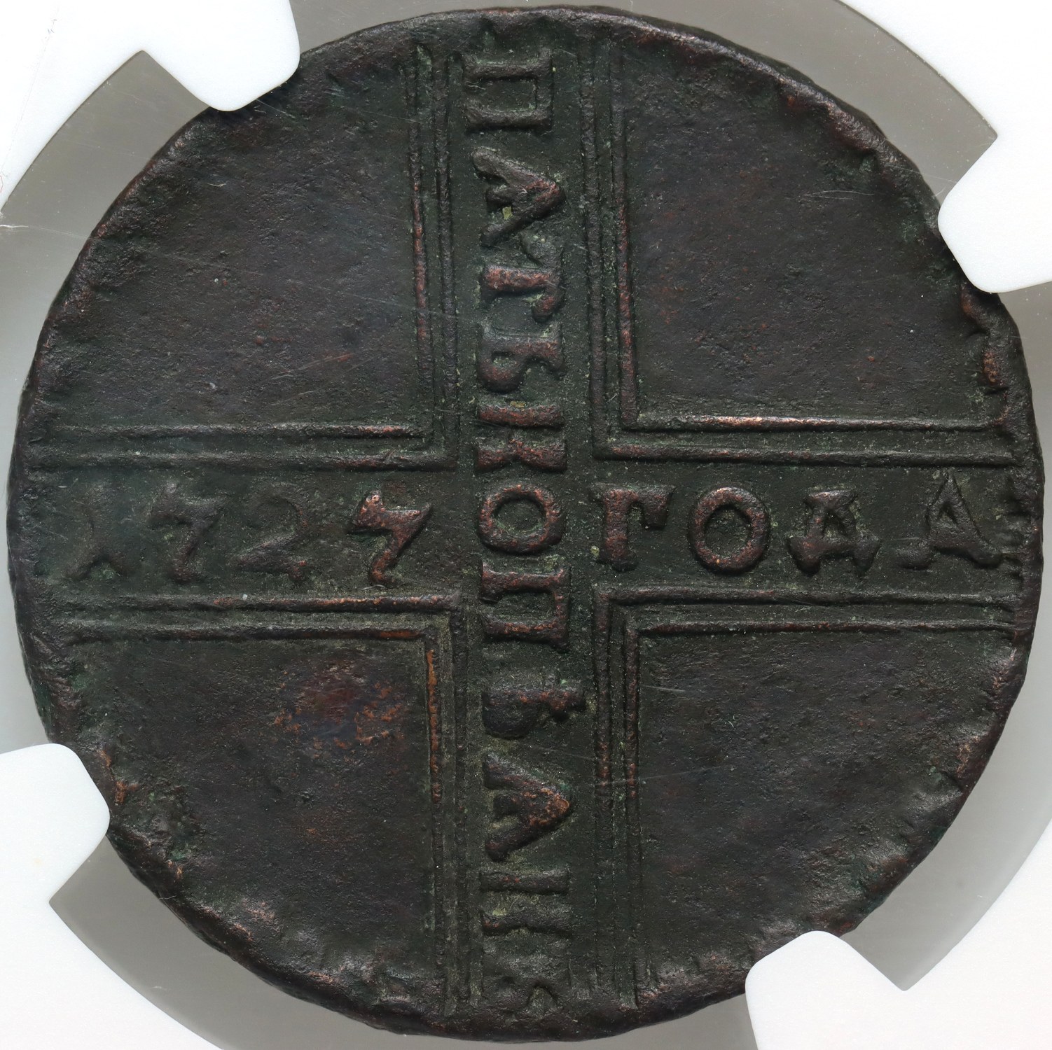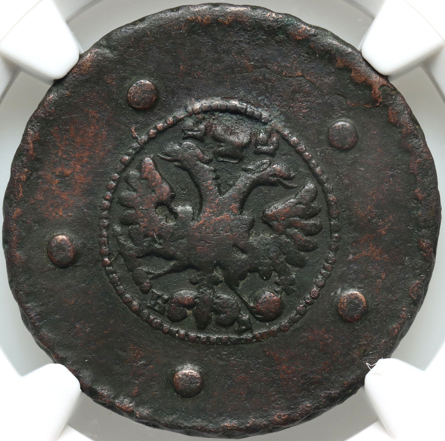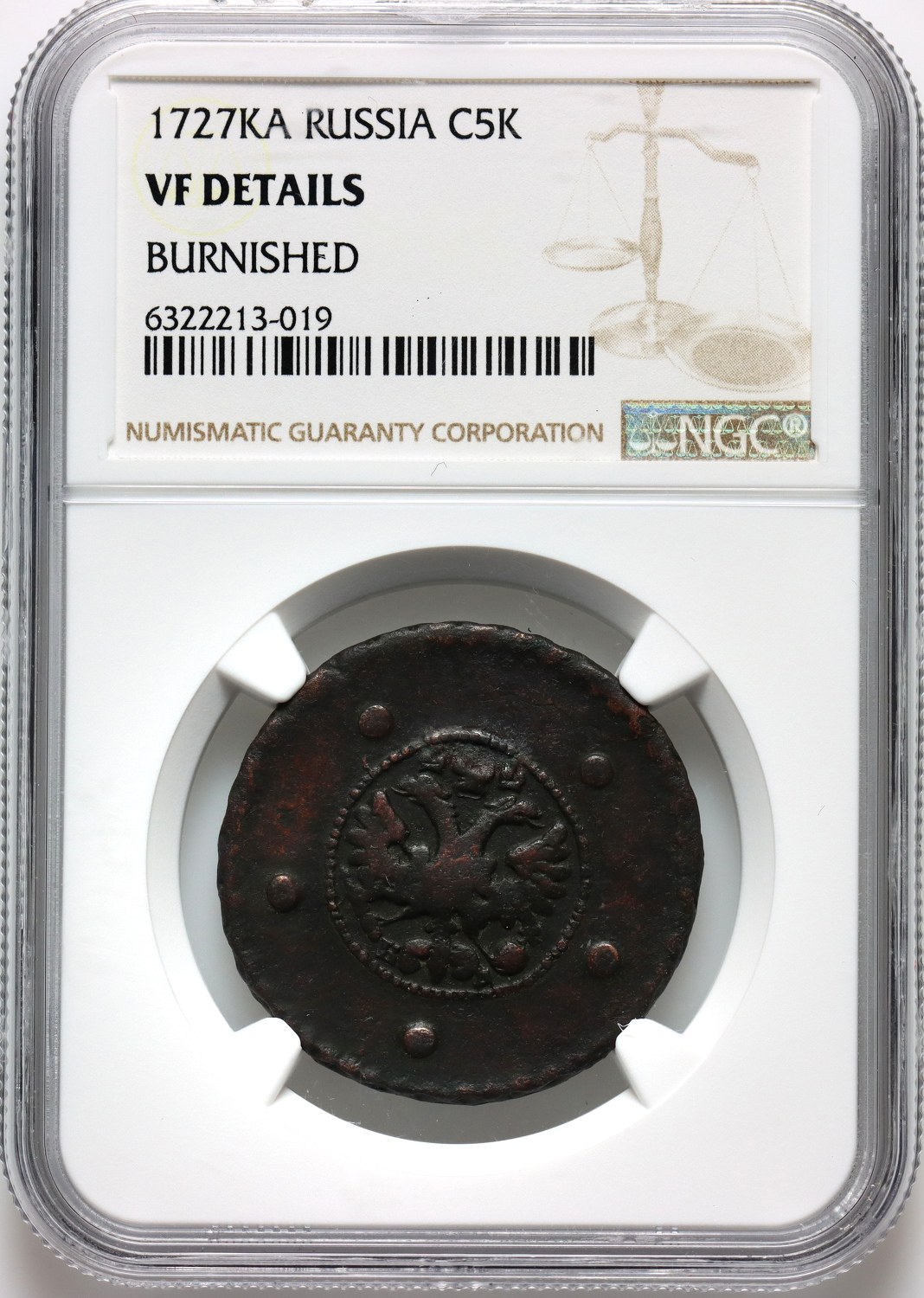 A scarce variety with a dot under the eagle's tail. Burnished.