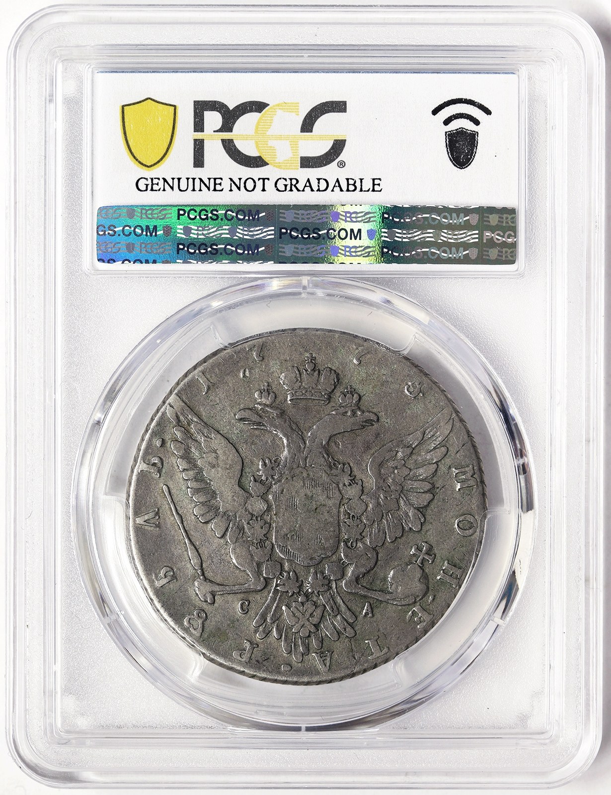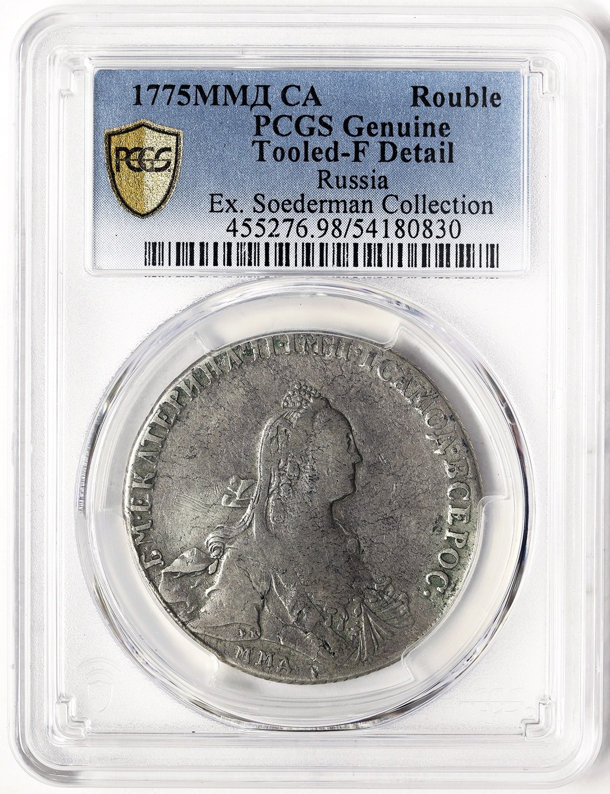 One of the rarest roubles struck during the reign of Catherine II ! Variant with ВК in the sleeve. From the Leonid Soderman Collection. Sold by Adolph Hess & Bank Leu # 39 07/11/1968 for 1425 CHF Ag.750 24,00 g