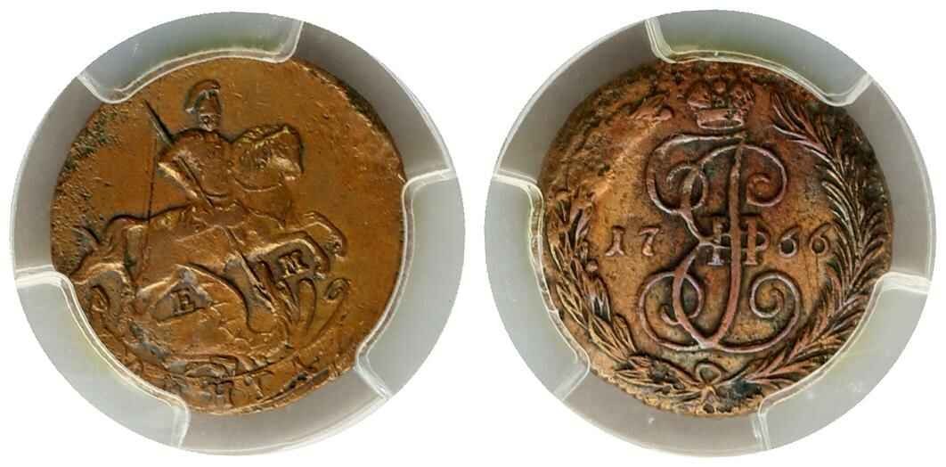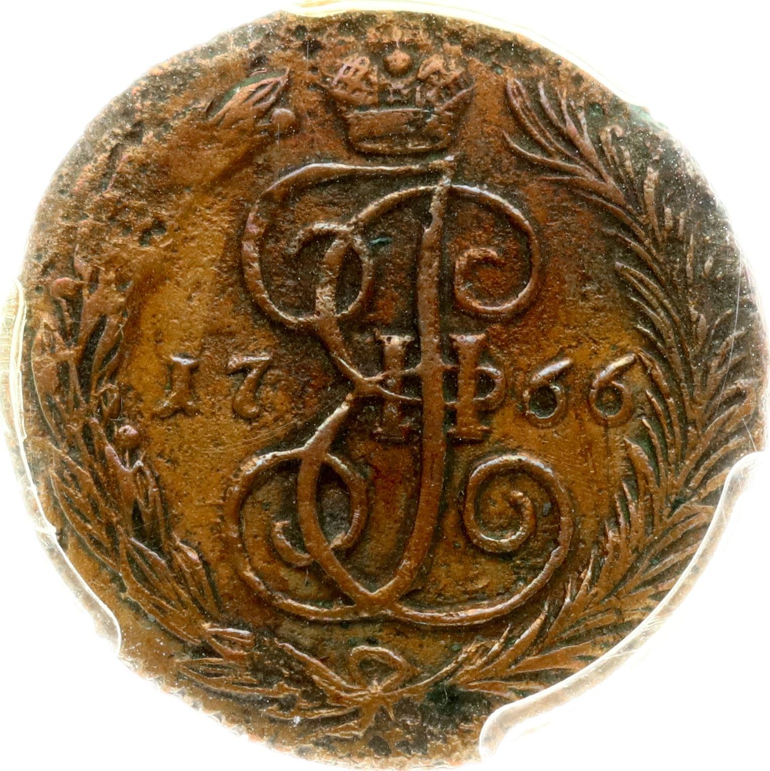 Russia. Catherine II (1762-1796). Denga 1766 ??. Copper. Bitkin 720. PCGS AU Details