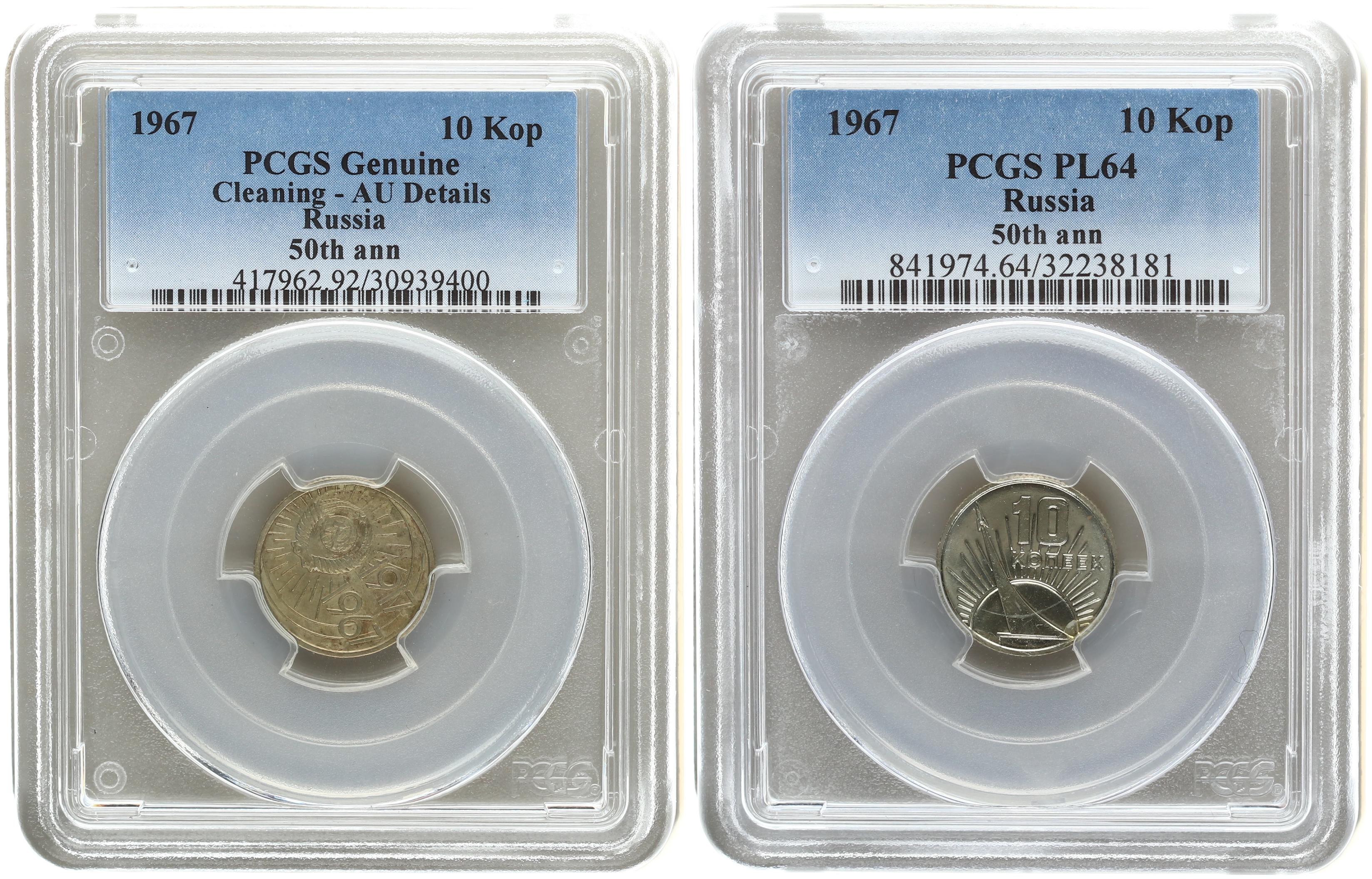 Russia Lot of 2 coins 10 Kopecks 1967. PCGS PL 64 and PCGS Genuine Cleaning ...