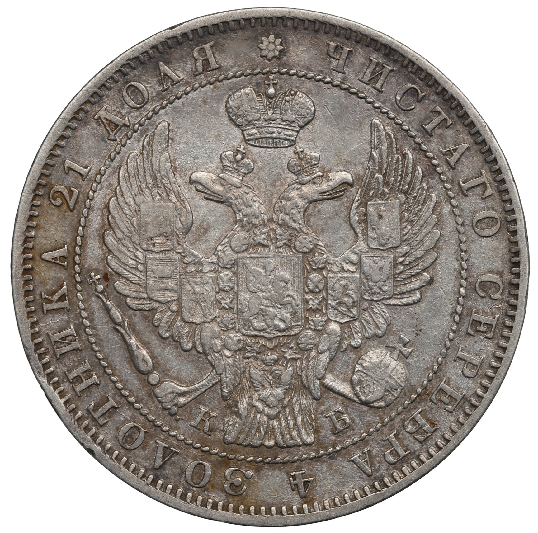Awers: ukoronowany orzeł Imperium Rosyjskiego, po bokach ogona inicjały КБ, w otoku legenda: