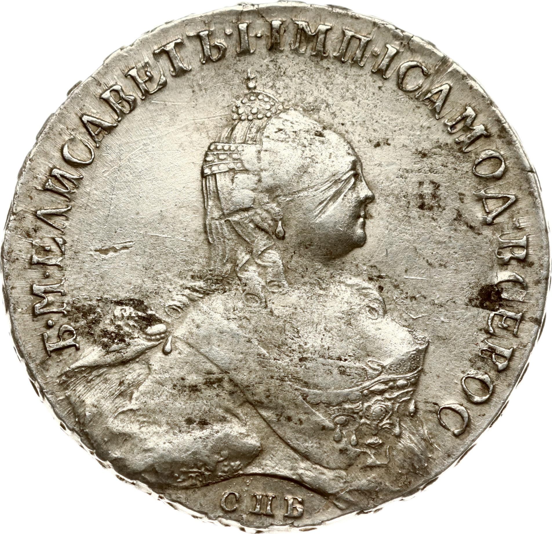 Russia. Elizabeth (1741-1762). Rouble 1760 СПБ-ЯI, St. Petersburg. 'Portrait by Timothy Ivanov'. Eagle by Ivanov. Silver 25.19 g. Bitkin - type missing, it and that this combination of reverse and obverse is described only for 1761. Conros missing. Small scratches. Very rare.