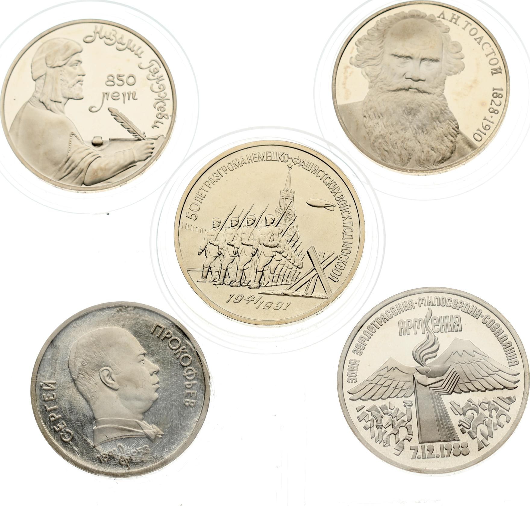 Russia USSR 1 & 3 Roubles 1988-1991 160th Anniversary - Birth of Leo Tolstoi; 100th Birthday of Sergey Prokofiev; 850th Anniversary - Birth of Nizami Gyanzhevi - Poet; Armenian Earthquake Relief; 50th Anniversary - Defense of Moscow. Copper-Nickel. Y 216; 263.1; 284; 234; 301. Lot of 5 Coins