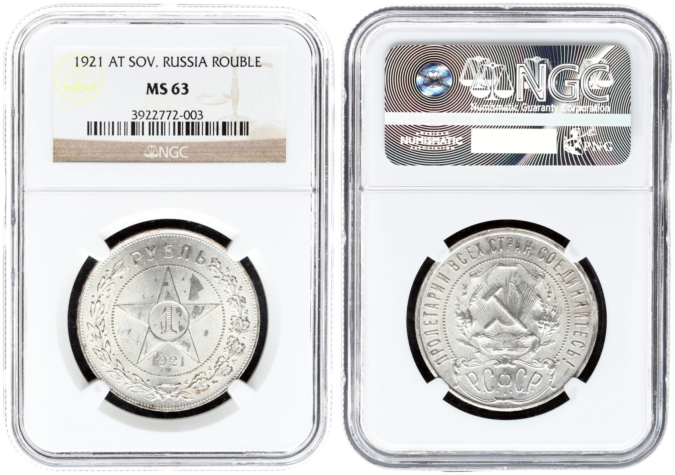 Russia USSR 1 Rouble 1921 АГ St. Petersburg mint. Soviet Federated Socialist Republic 1918-1923. Averse: Star centre I over date; above value. Reverse: Symbols of the Soviet Republic. Dated 1921 АГ. Edge Lettering: Mintmaster's initials. Silver. Dav. 300; KM. 84. NGC MS 63