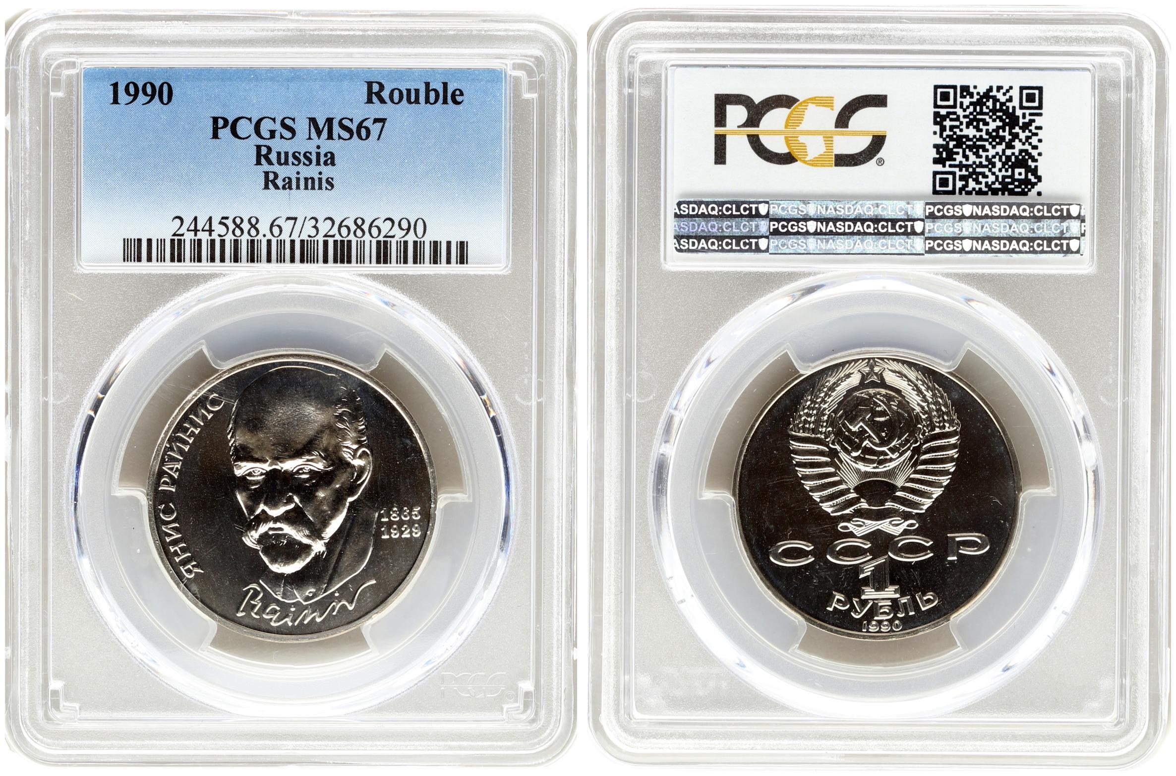 Russia USSR 1 Rouble 1990 125th Anniversary - Birth of Janis Rainis. Averse: National arms divide CCCP with value below. Reverse: Head facing with dates at right. Edge Description: Cyrillic lettering. Copper-Nickel. Y 257. PCGS MS67 ONLY ONE COIN IN HIGHER GRADE