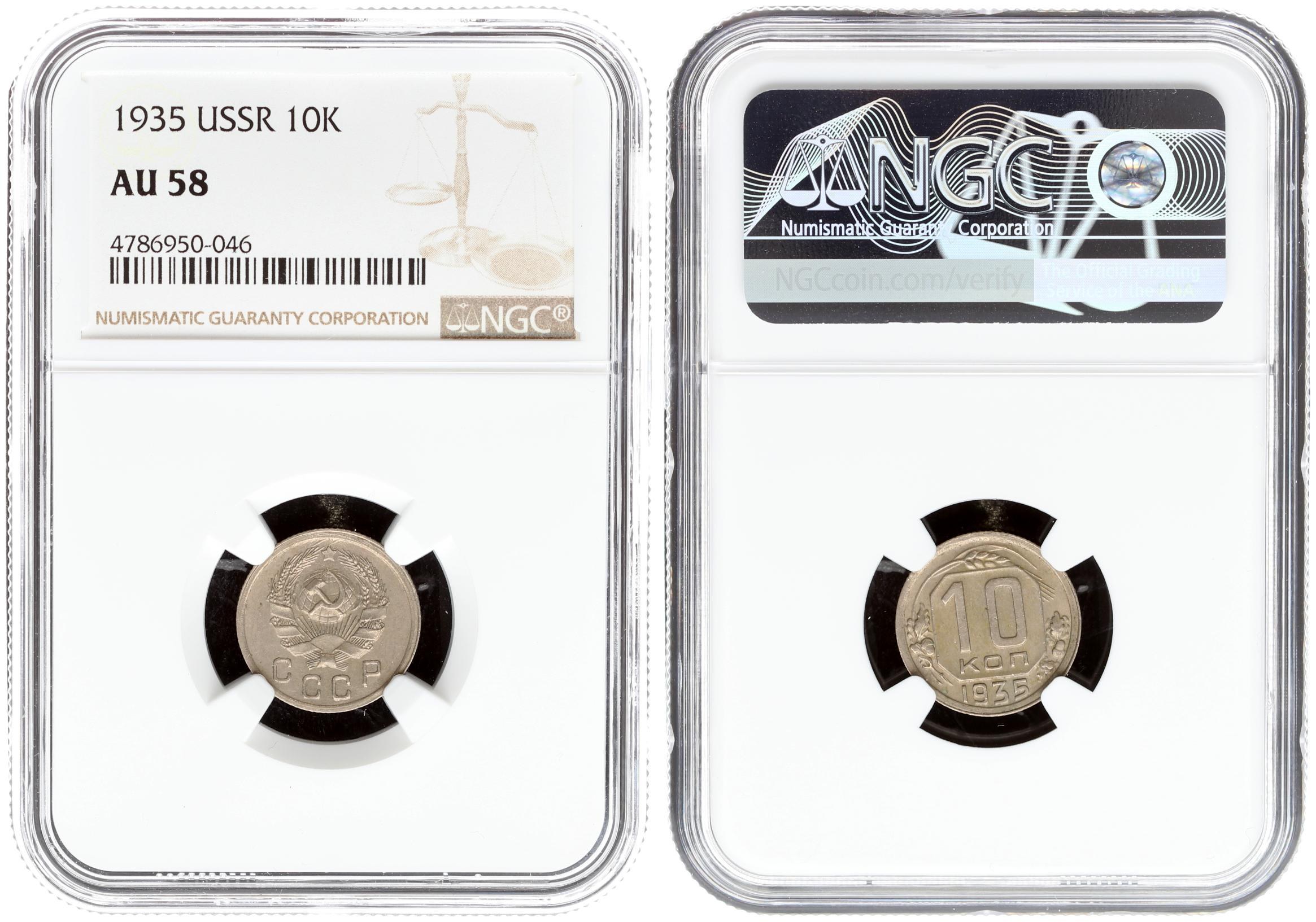 Russia USSR 10 Kopecks 1935. Averse: National arms. Reverse: Value within octagon flanked by sprigs with date below. Edge Description: Reeded. Copper-Nickel. Y 102. NGC AU 58