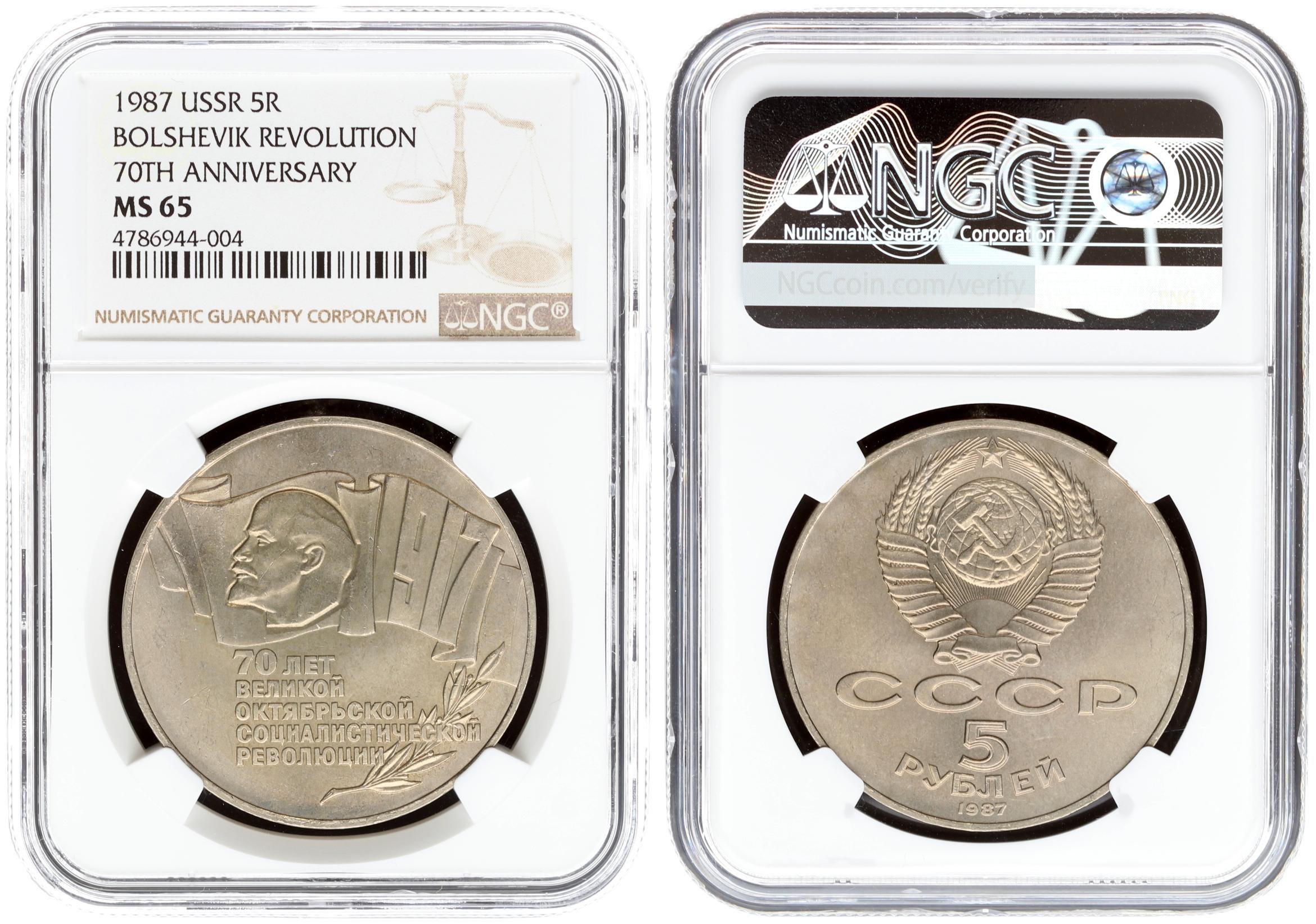 Russia USSR 5 Roubles 1987 70th Anniversary - Bolshevik Revolution. Averse: National arms with CCCP and value below. Reverse: Head left and date within banne. Copper-Nickel. Y 208. NGC MS 65
