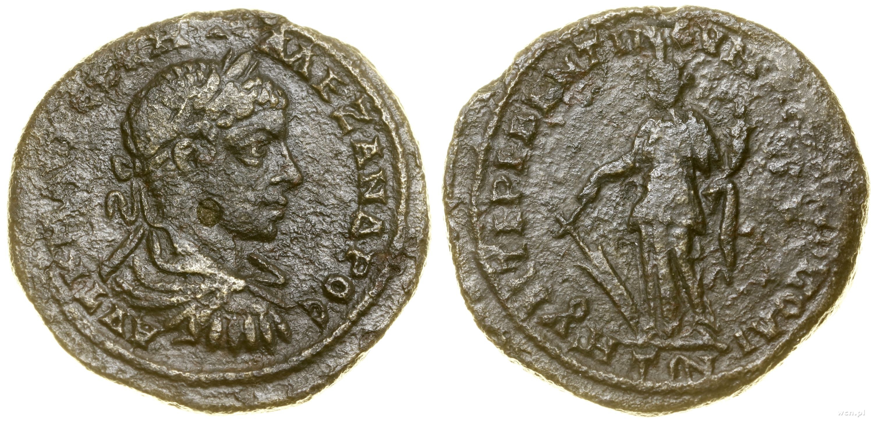Aw: Popiersie Aleksandra Sewera w prawo, w wieńcu laurowym, AVT K M AVP CEVH AΛEZANΔPOC, Rw: Tyche stojąca w lewo, trzymająca ster i róg obfitości, HΓ 8M TEPԐBENTINOY MAPKIANOΠOΛITΩN