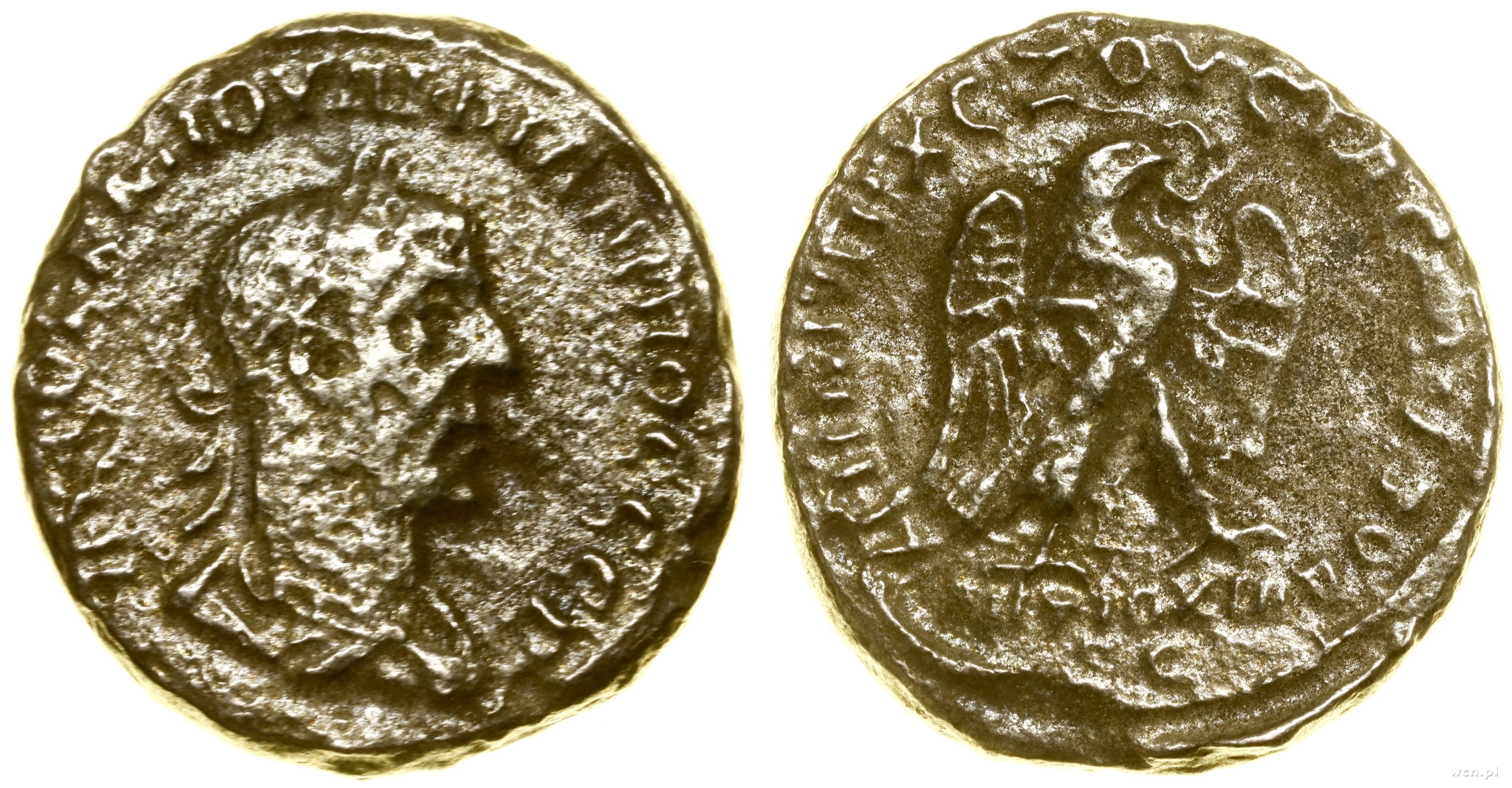 Aw: Popiersie cesarza w wieńcu laurowym w prawo, ΑΥΤΟΚ Κ Μ ΙΟΥΛΙ ΦΙΛΙΠΠΟC CΕΒ; Rw: Orzeł z wieńcem laurowym w dziobie stojący w prawo, ΔΗΜΑΡΧ ΕΞOYCIAC YΠΑ ΤΟ Δ, w odcinku ANTIOXIA SC