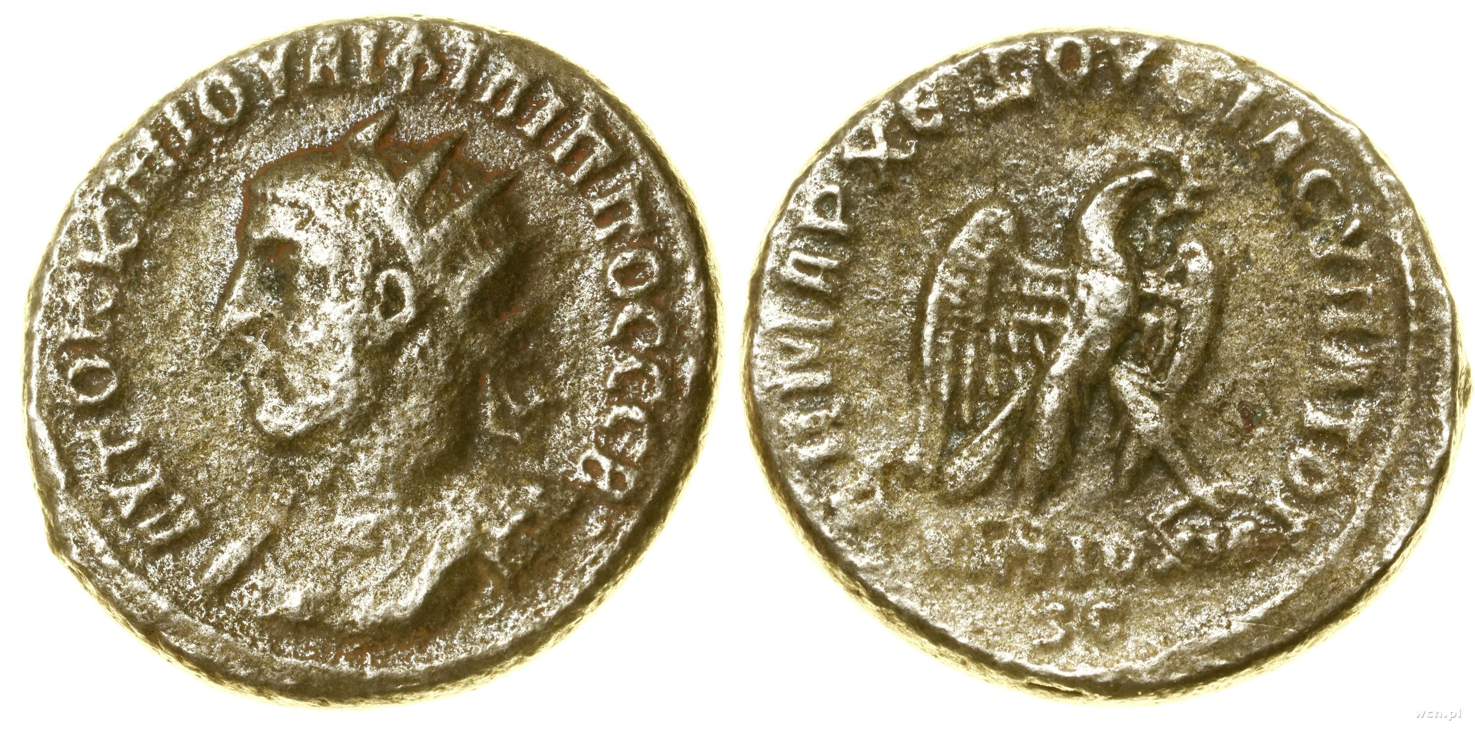 Aw: Popiersie cesarza w koronie radialnej w lewo, ΑYΤΟΚ Κ Μ ΙΟΥΛI ΦΙΛIΠΠΟC CEΒ; Rw: Orzeł z wieńcem laurowym w dziobie stojący w prawo, ΔΗΜΑΡΧ EΞΟYCΙΑC YΠΛTOΓ, poniżej orła ANTIOXIA / SC