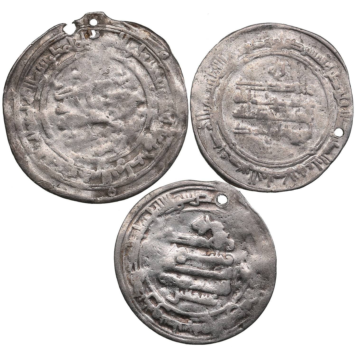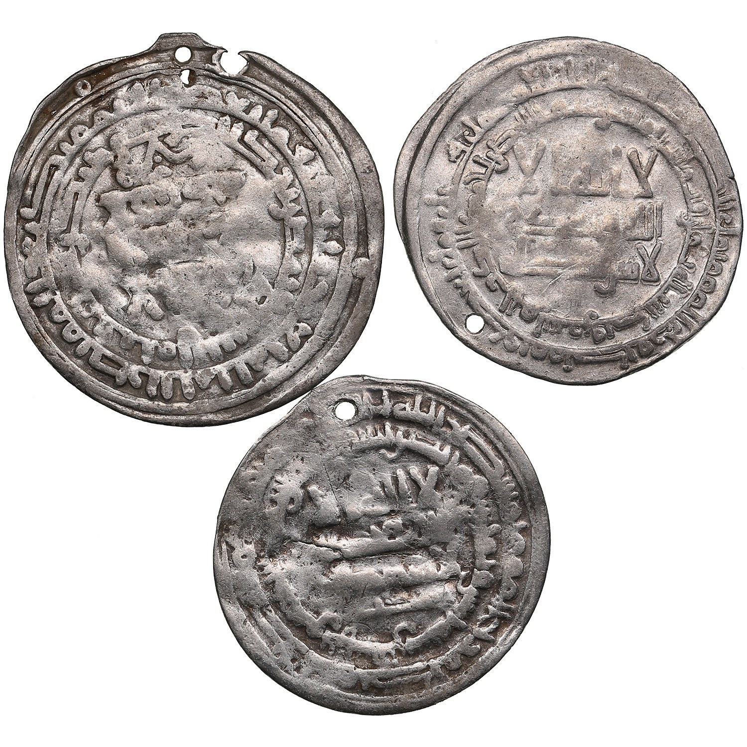 Various condition. With holes. 1) Imitation of Samanid dirham (?) 2.76g, 31mm; 2) Isma'il b. Ahmad, Samarqand 288 AH. Zeno 199020. 2.79g, 28mm; 3) Isma'il b. Ahmad, al-Shash/Binkath 282 AH. Zeno 271235. 2.62g, 26mm.