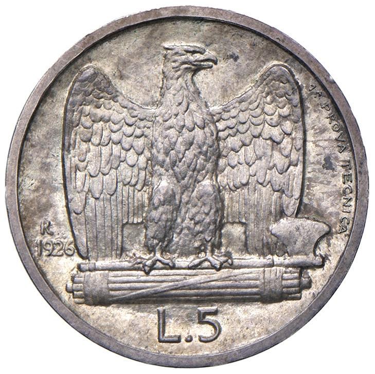 Vittorio Emanuele III (1900-1946) 5 Lire 1926 Prima prova tecnica - P.P. 226 AG RR Graffietti al D/