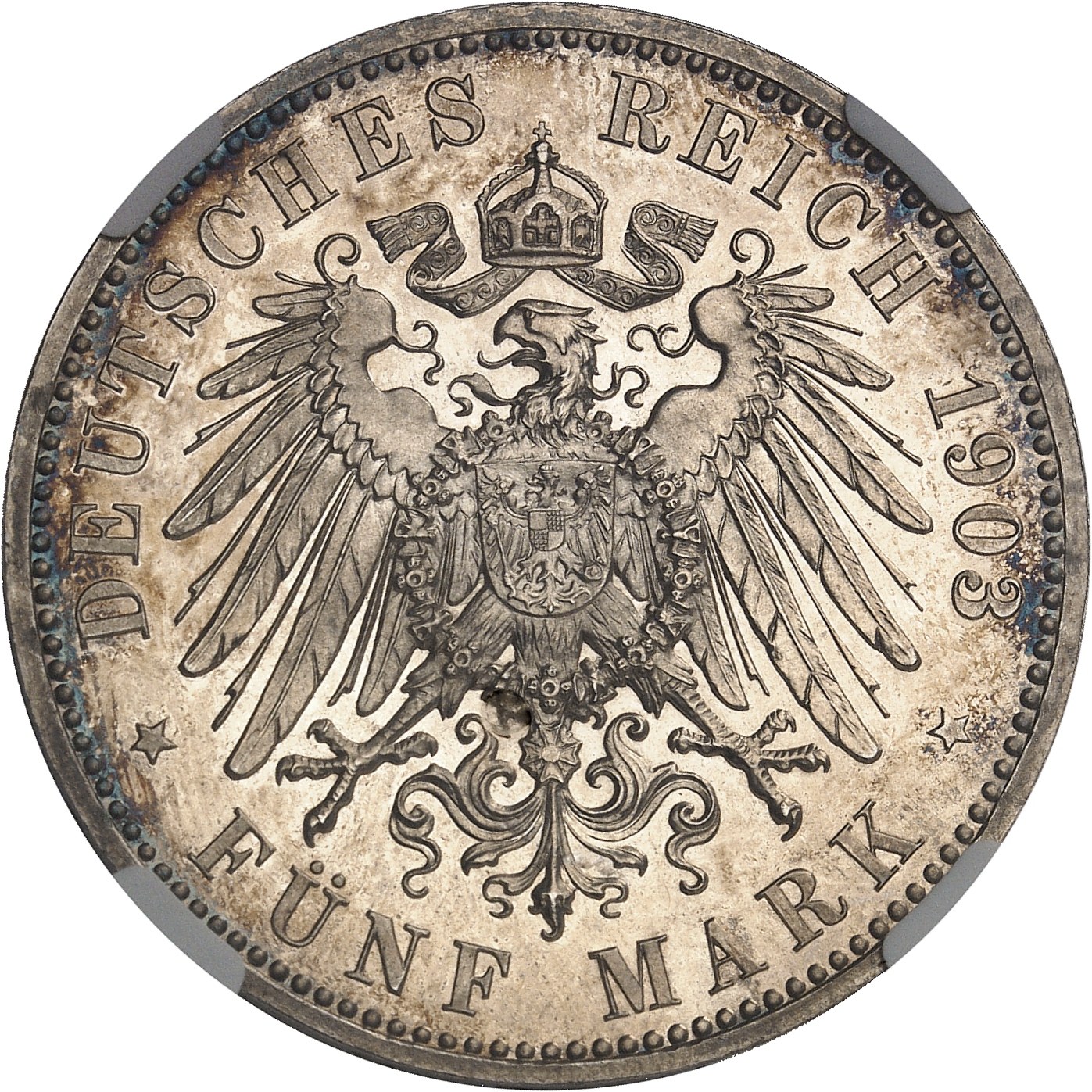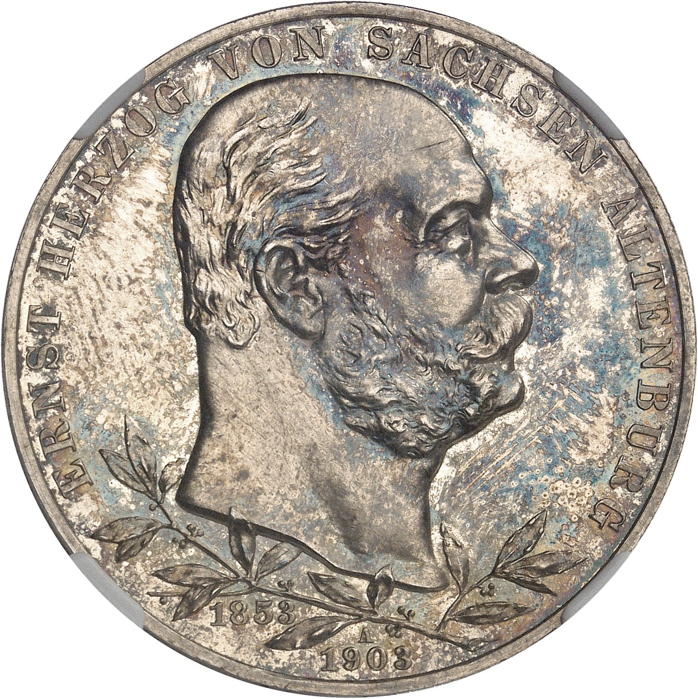 Saxe-Altenburg, Ernst I (1853-1908). 5 (fünf) mark pour le Jubilé d’or, Flan bruni (PROOF) 1903, A, Berlin. NGC PF 63 (6630881-006).