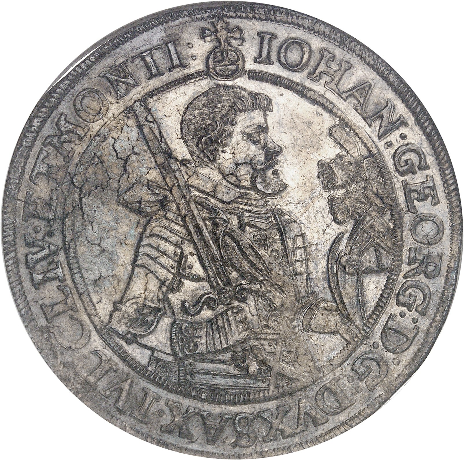 Av. IOHAN: GEORG: D: G: DVX: SAX: IVL: CLIV: ET MONTI. Buste cuirassé à droite, tenant l’épée levée et un heaume.