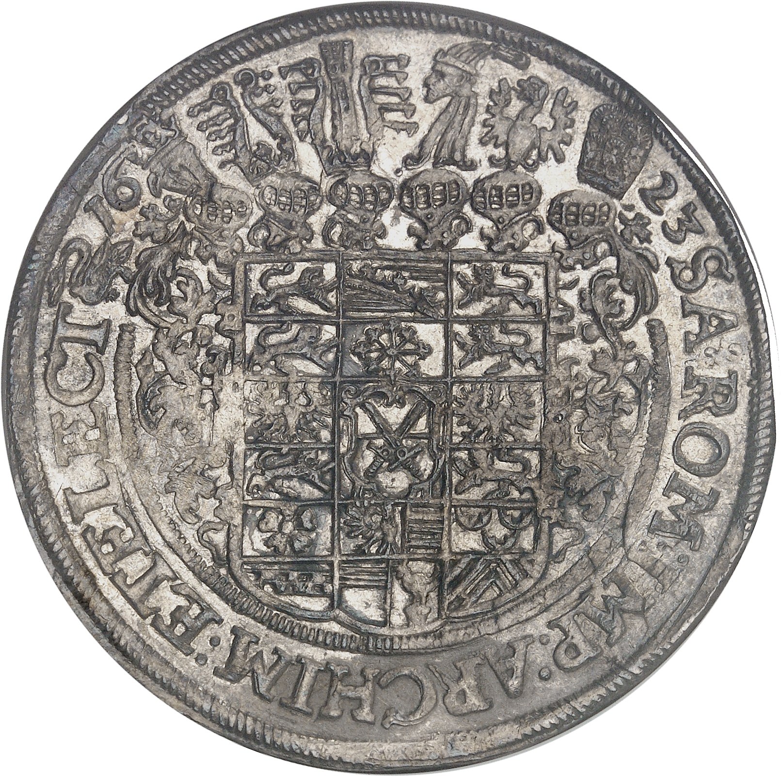 Rv. SA: ROM: IMP: ARCHIM: ET ELECT (date). Écu parti et surmonté de cinq casques tarés et lambrequinés.