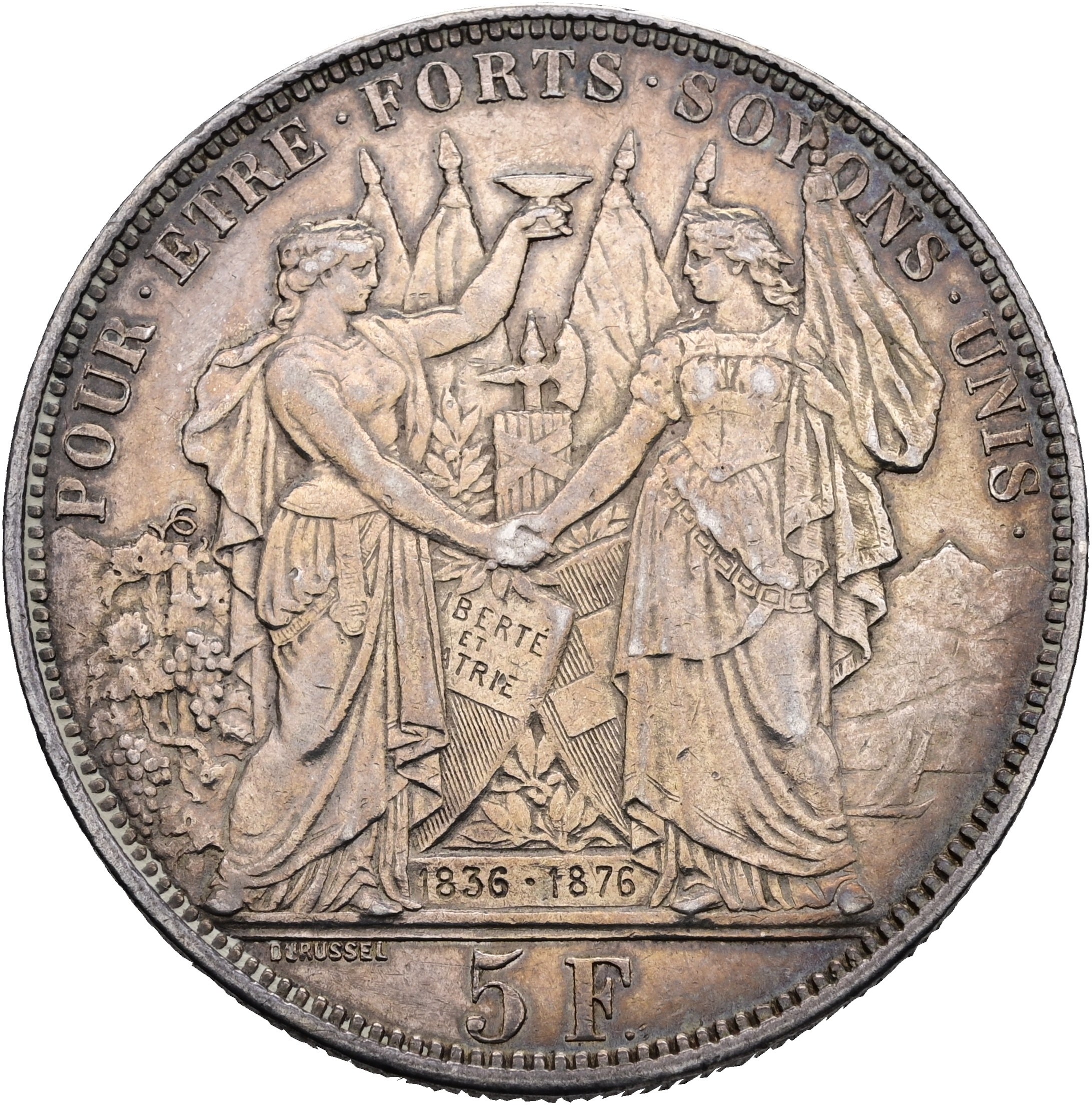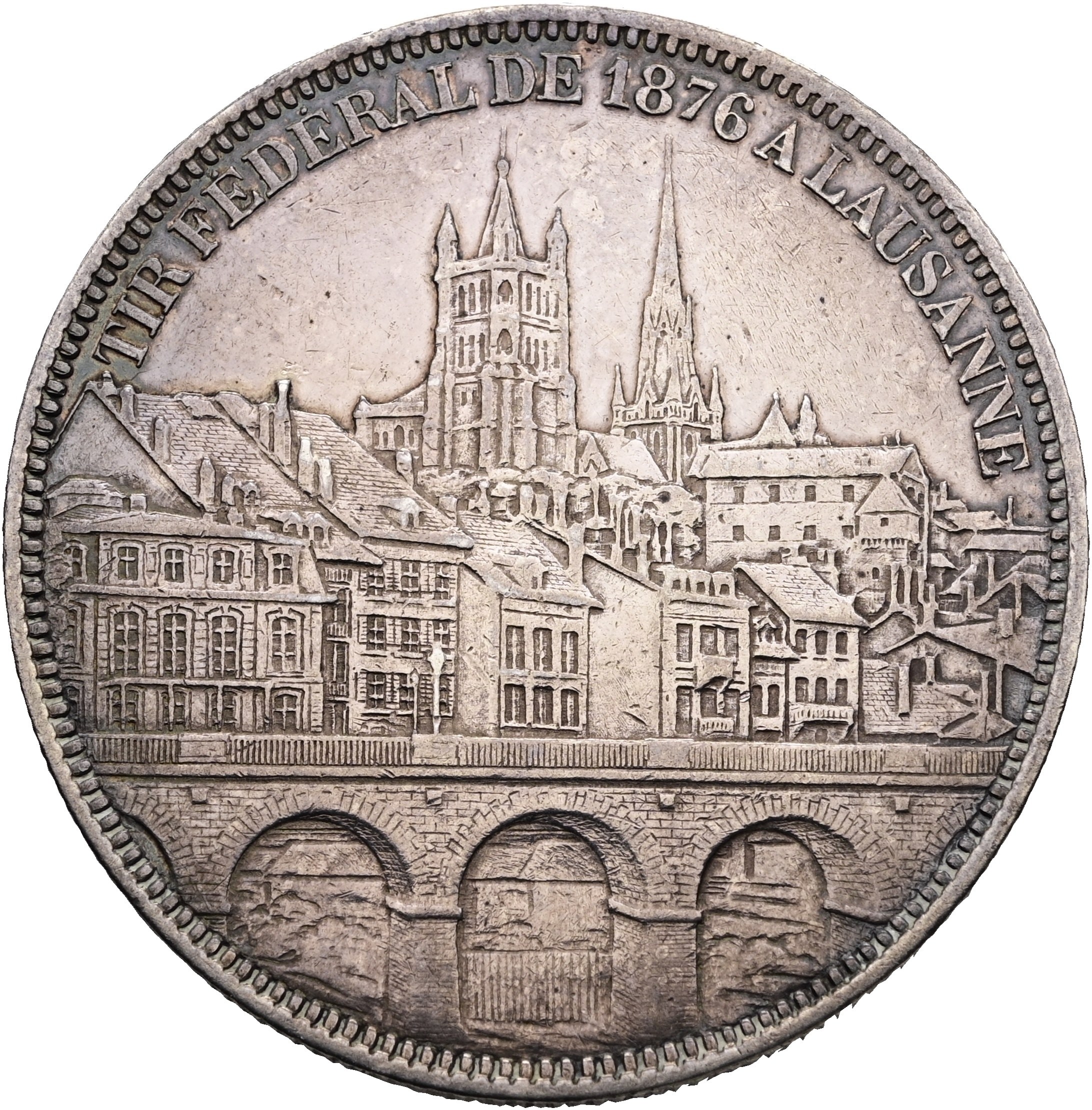 Silber-Schützentaler 5 Franken auf das Eidgenössische Schützenfest in Lausanne 1876 / Tir Fédéral (Schützenmedaillen Richter 1560a)