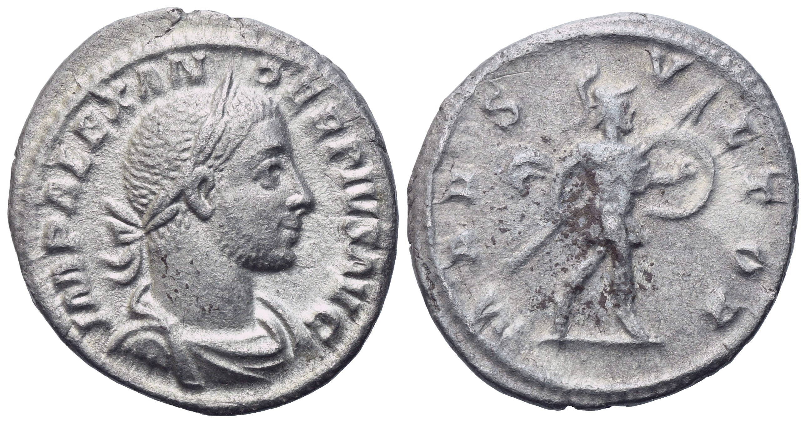 IMP ALEXANDER PIVS AVG Laureate and draped bust r.; Rv. MARS VLTOR Mars walking r. holding spear and shield. RIC 146; Cohen 161. Good very fine.