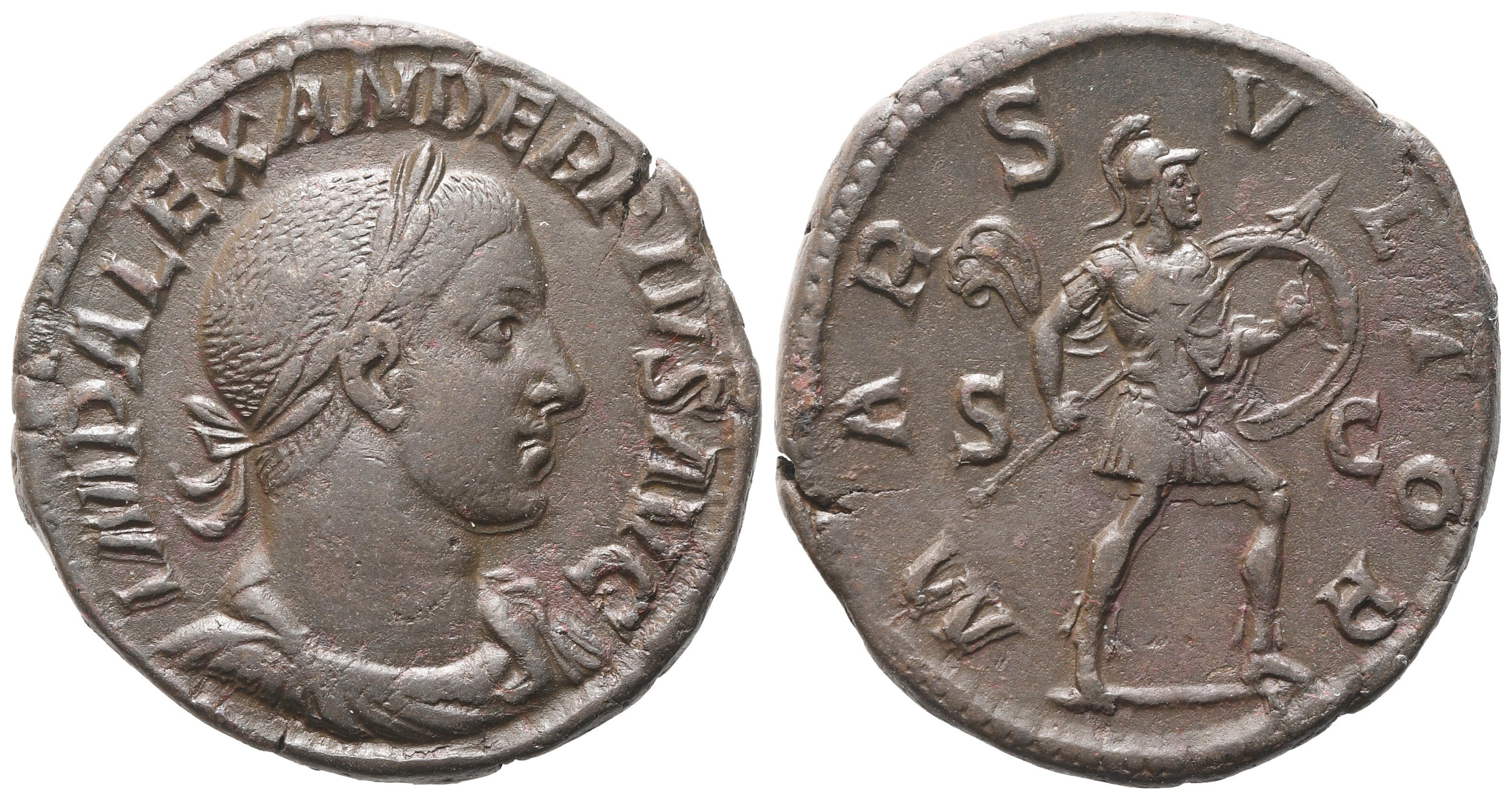 IMP ALEXANDER PIVS AVG Laureate, draped and cuirassed bust r.; Rv. MARS VLTOR Mars helmeted, advancing r., carrying spear and shield; S-C across fields. Dark brown patina. RIC 635; Cohen 169. Extremely fine.
