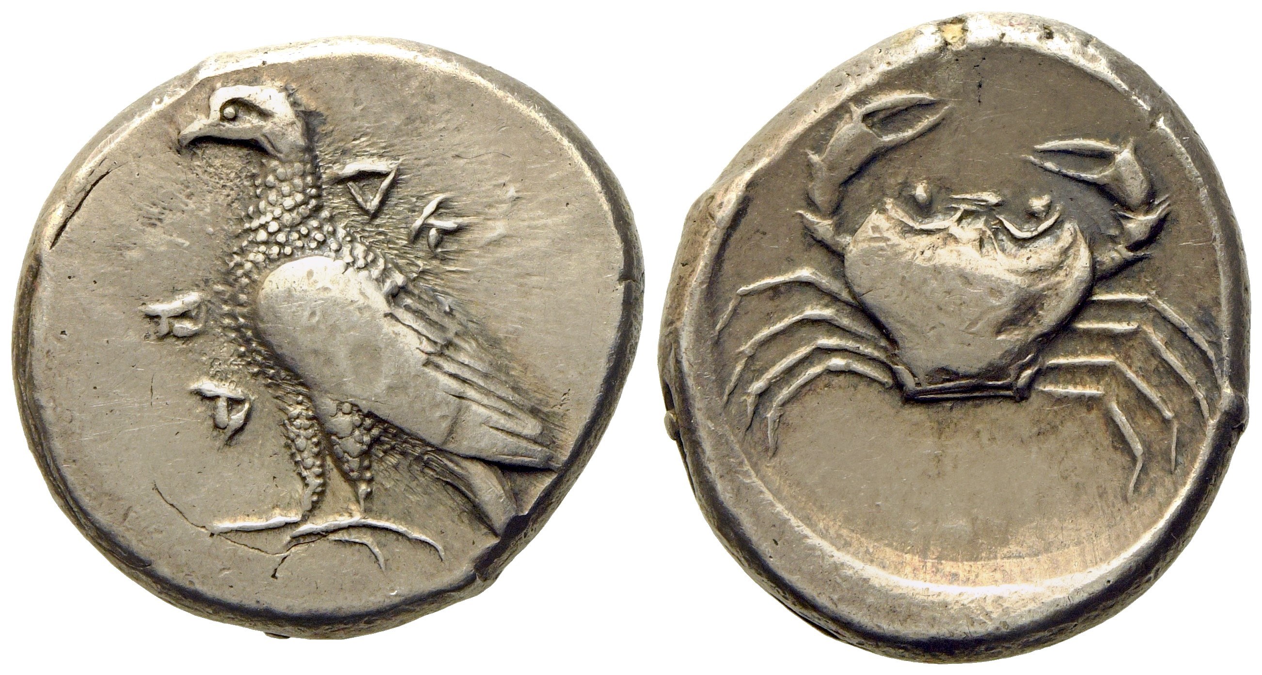 Sea-eagle standing left, AK to right, RA to left, Rv. Crab within shallow circular incuse. SNG III 699; SNG ANS 950-953. Good very fine / near extremely fine.